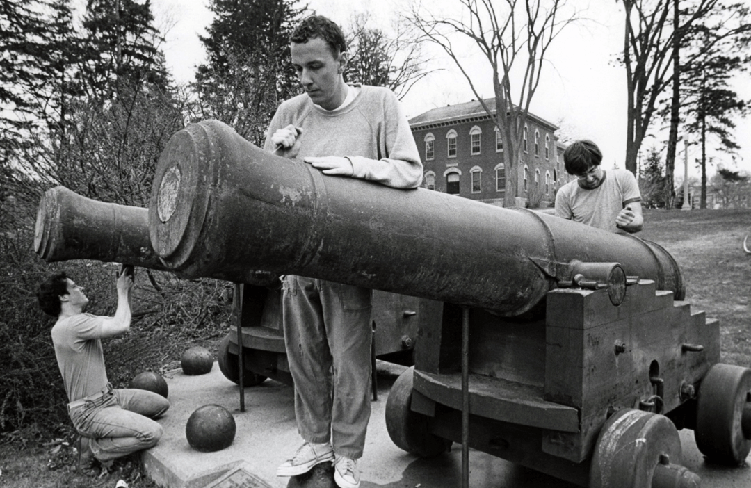 8-Inch Rifle aboard USS Enterprise.  Both of the University of Maine’s cannon would have been mounted in a similar fashion. The tracks on the deck allow the cannon to be shifted to fire from either side of the ship. The majority of the crew is needed just to provide the strength needed to move the 17,000 pounds of cannon and it’s 7,000 pound iron carriage.