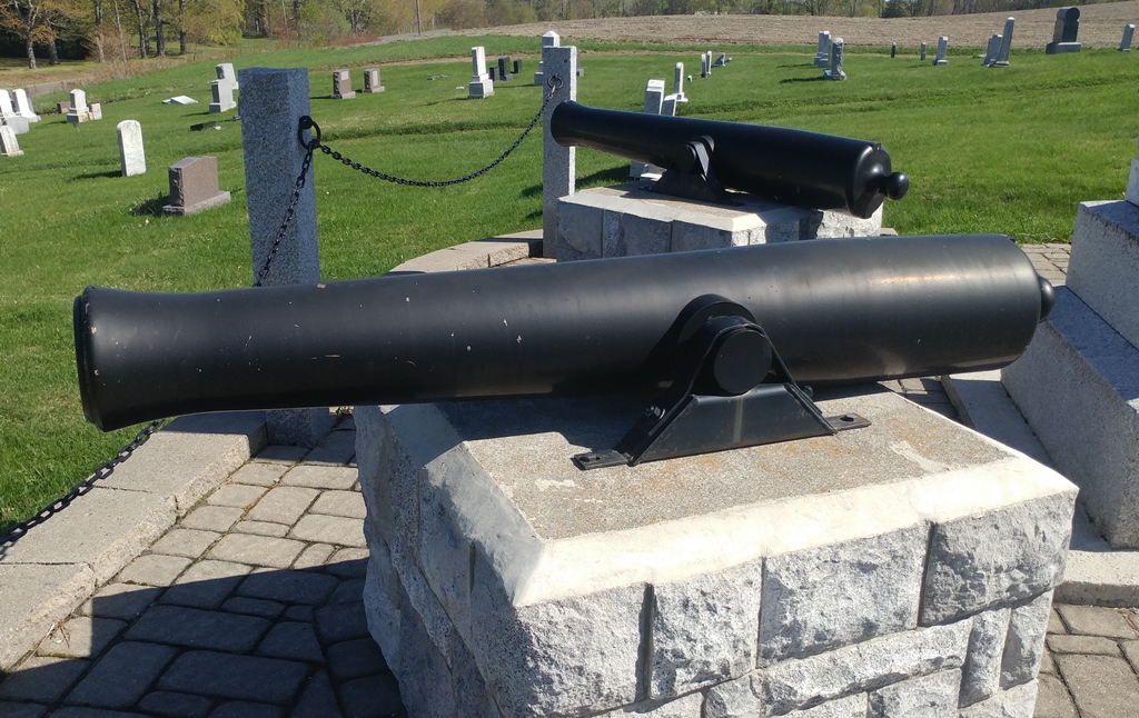 Sherman Civil War Memorial in a cemetery on a hill overlooking the town, with a pair of Bronze 12-pounder Napoleon Model 1857 smoothbore muzzle-loading Gun-Howitzers, (Federal Gun with muzzle swell used in the Civil War), mounted on concrete stands.
