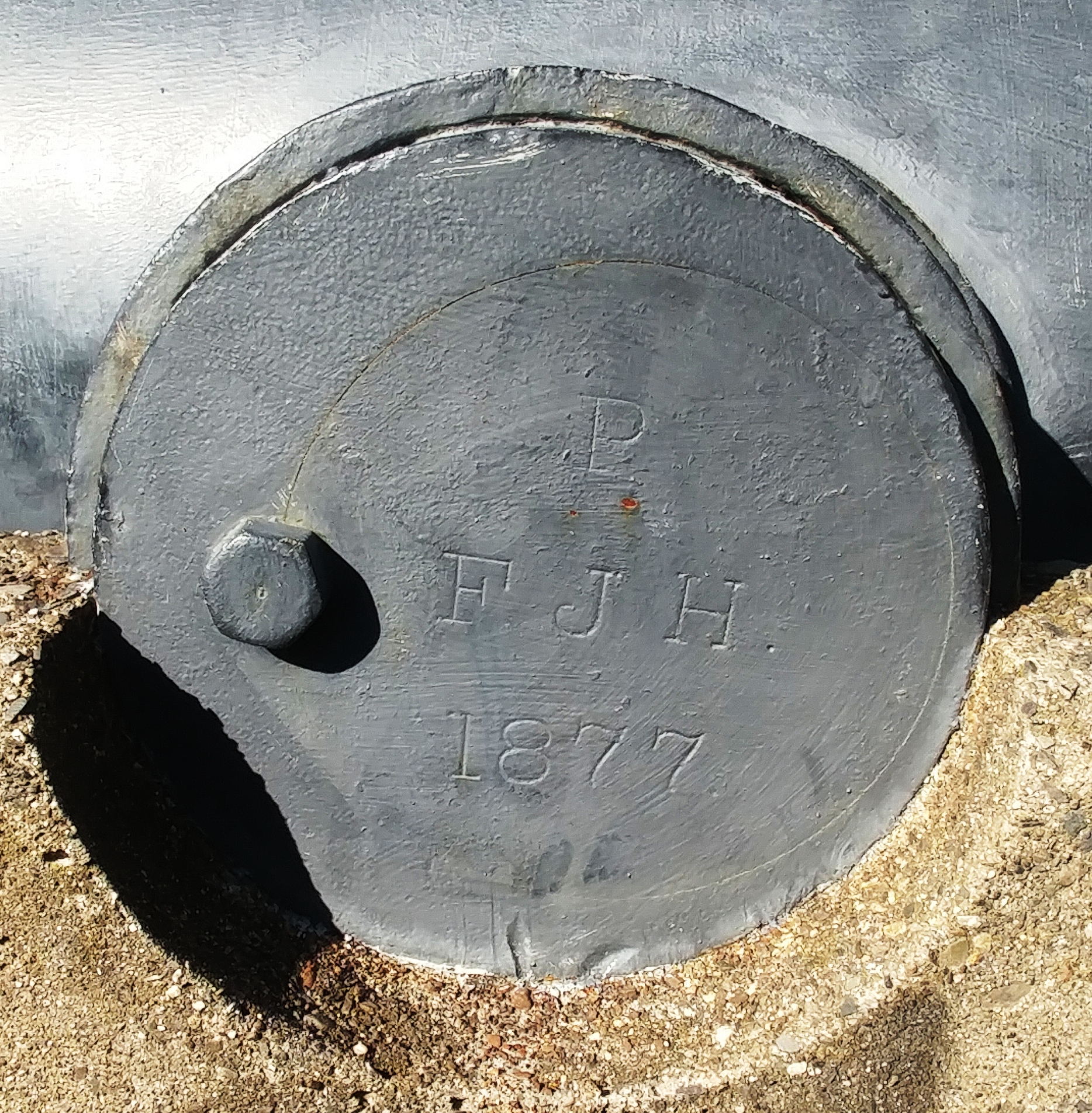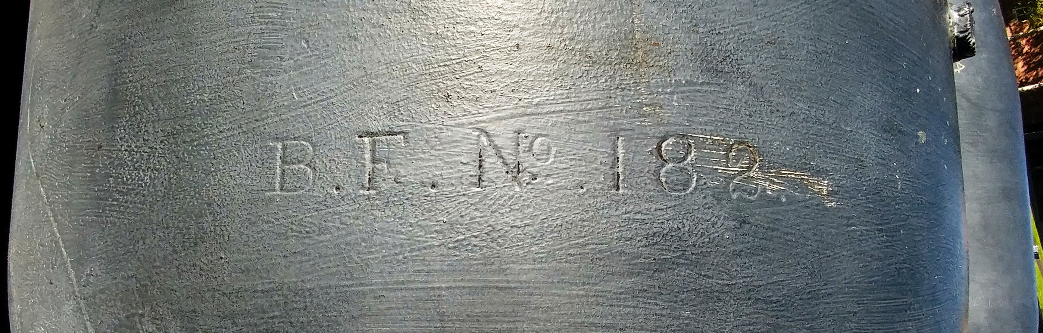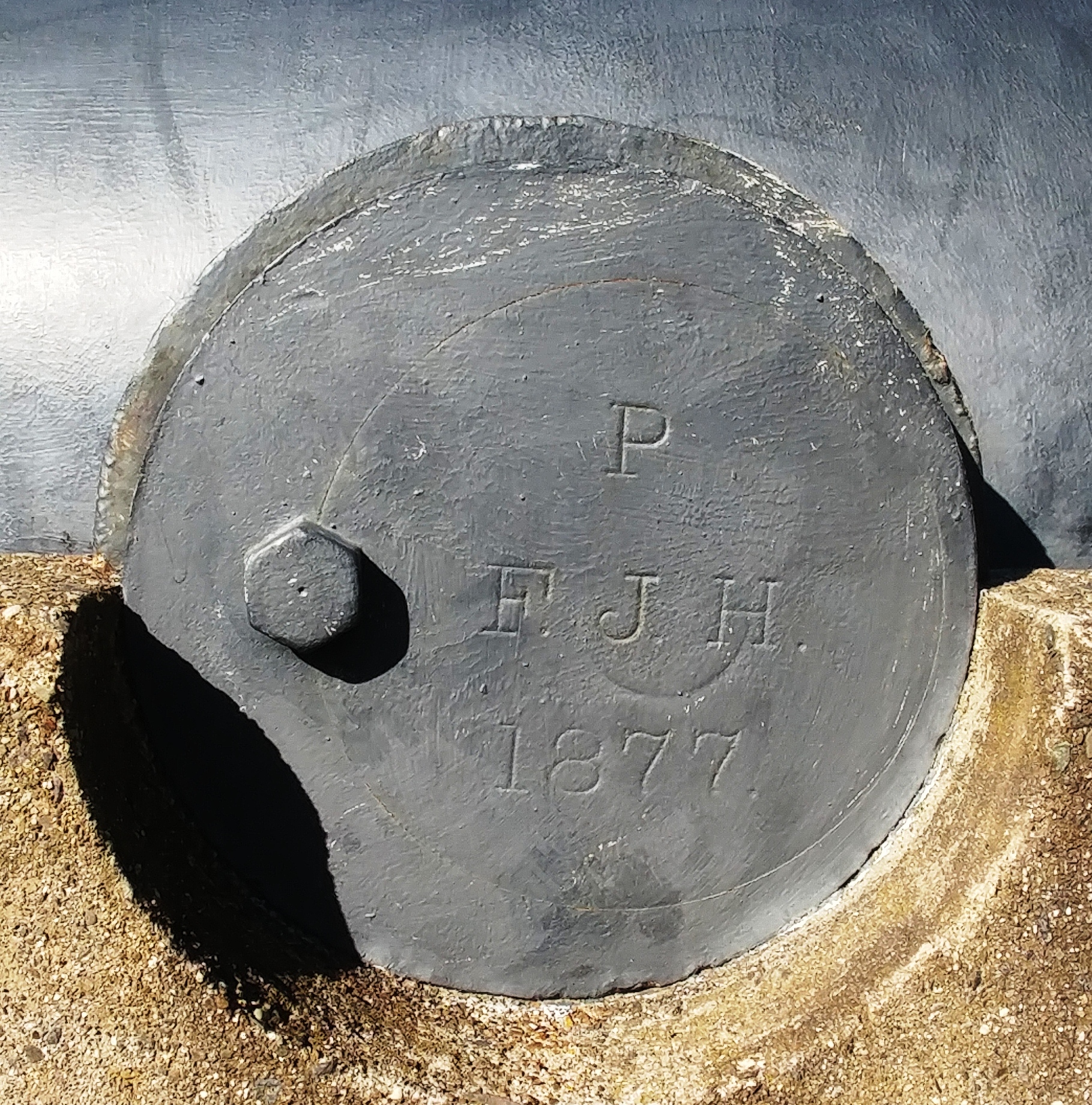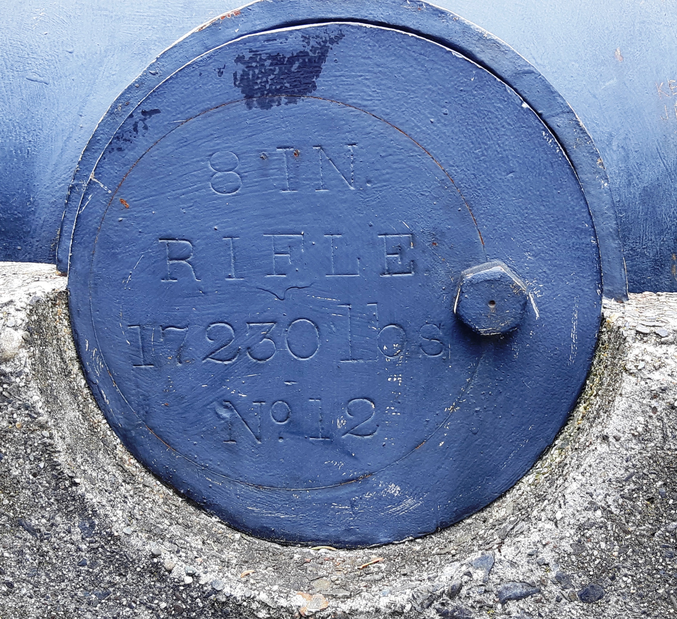 Cast-iron 8-inch Rifle, (P, F.J.H., 1877) on left trunnion, B.F. No. 182, on the barrel, (8 IN Rifle, 17,230 lbs, No. 12) on the right trunnion, mounted on a concrete stand, No. 1 of 2. This is an 11-Inch Dahlgren (cast iron) bored out to 13.5-Inches with an 8-Inch rifled wrought-iron sleeve inserted. (Santee1821)