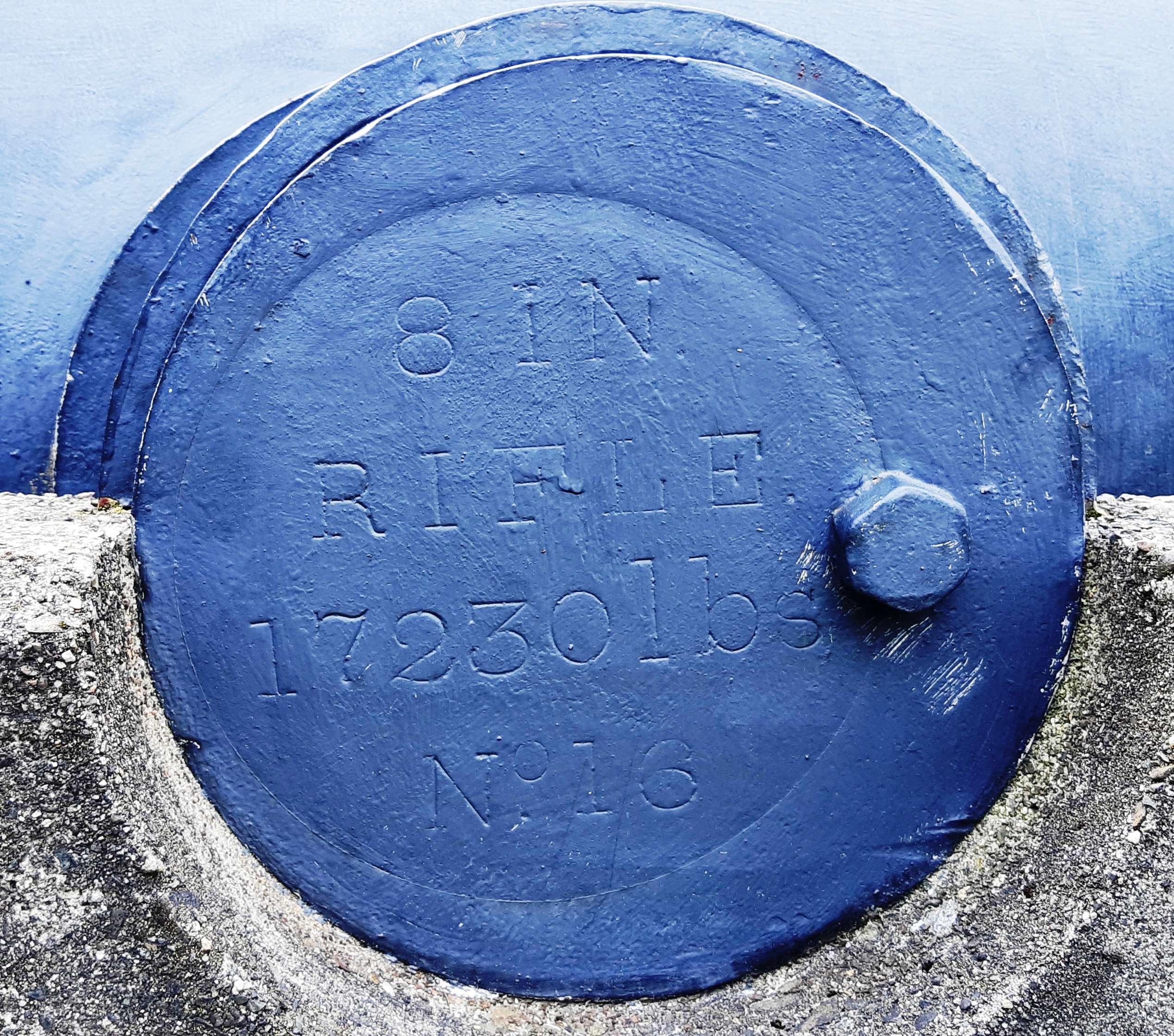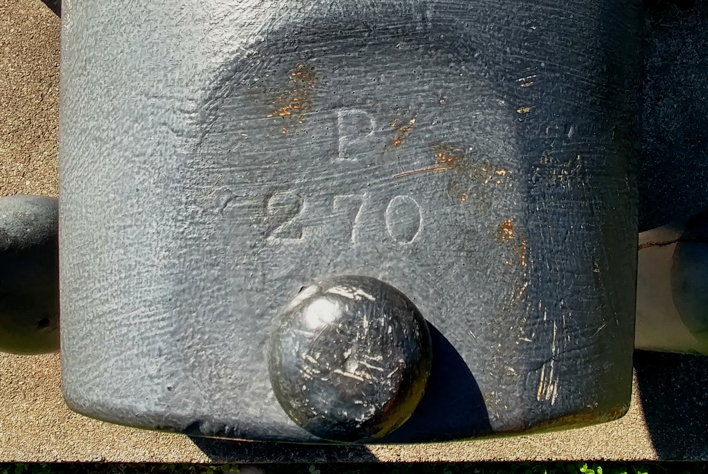 Cast-iron 8-inch Rifle, (P, F.J.H., 1877) on left trunnion, B.F. No. 186, on the barrel, (8 IN Rifle, 17,230 lbs, No. 16) on the right trunnion, P, 270 on the button, mounted on a concrete stand, No. 2 of 2. This is an 11-Inch Dahlgren (cast iron) bored out to 13.5-Inches with an 8-Inch rifled wrought-iron sleeve inserted. (Santee1821)