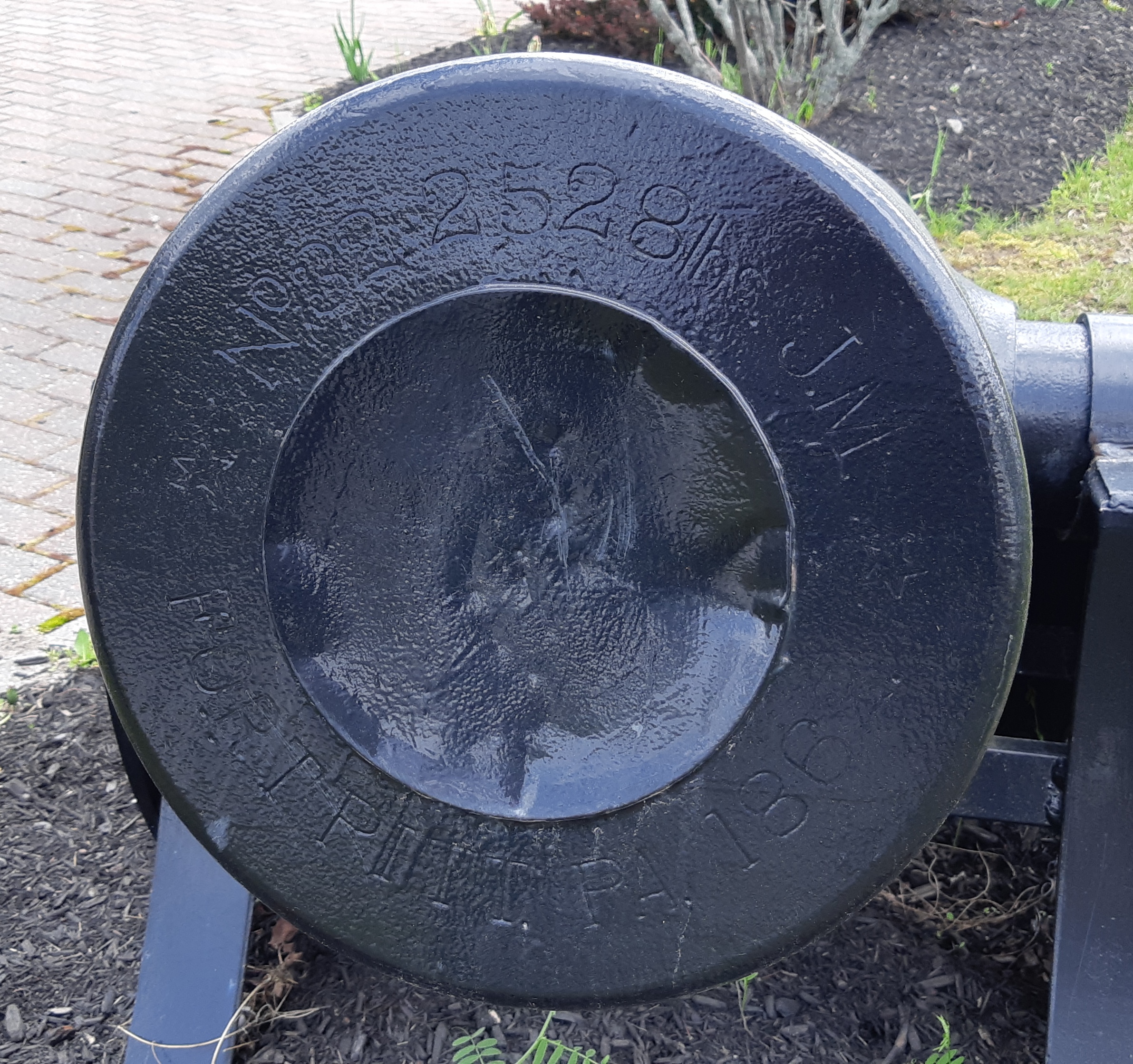 Cast-iron 8-inch smoothbore muzzle-loading Siege Howitzer, No. 32, 2,528 lbs, JM*, FORT PITT, PA, 1862 on the muzzle, No. 2 of 2 mounted on a concrete stand.  These two guns were donated to the local Rockland Chapter of the Grand Army of the Republic by the Federal Government in 1897.