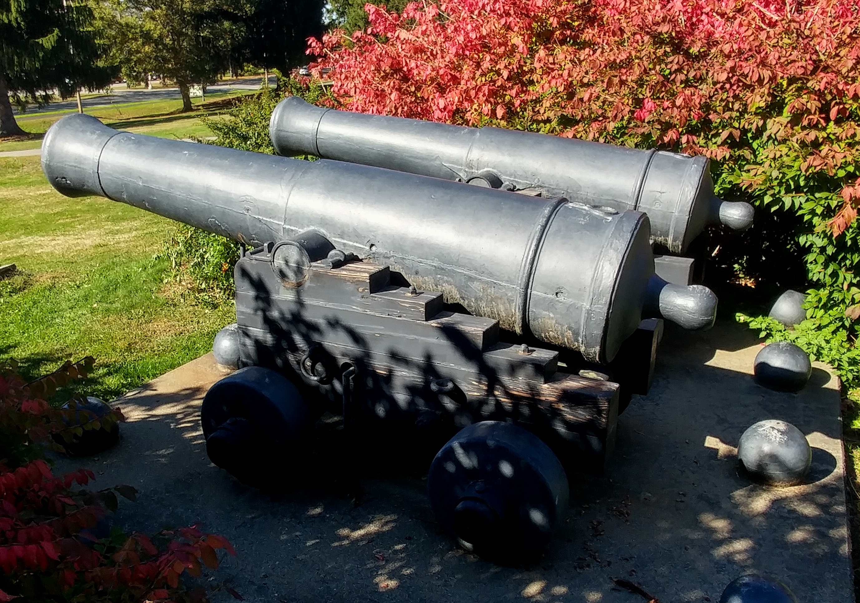 Cast-iron 8-inch smoothbore muzzle-loading Siege Howitzer, No. 12, CA & Co, 2,544 lbs, TJP 1863 on the muzzle, No. 1 of 2 mounted on a concrete stand, with a set of nine-inch cannon balls are stacked nearby (far larger than the muzzle of the gun).