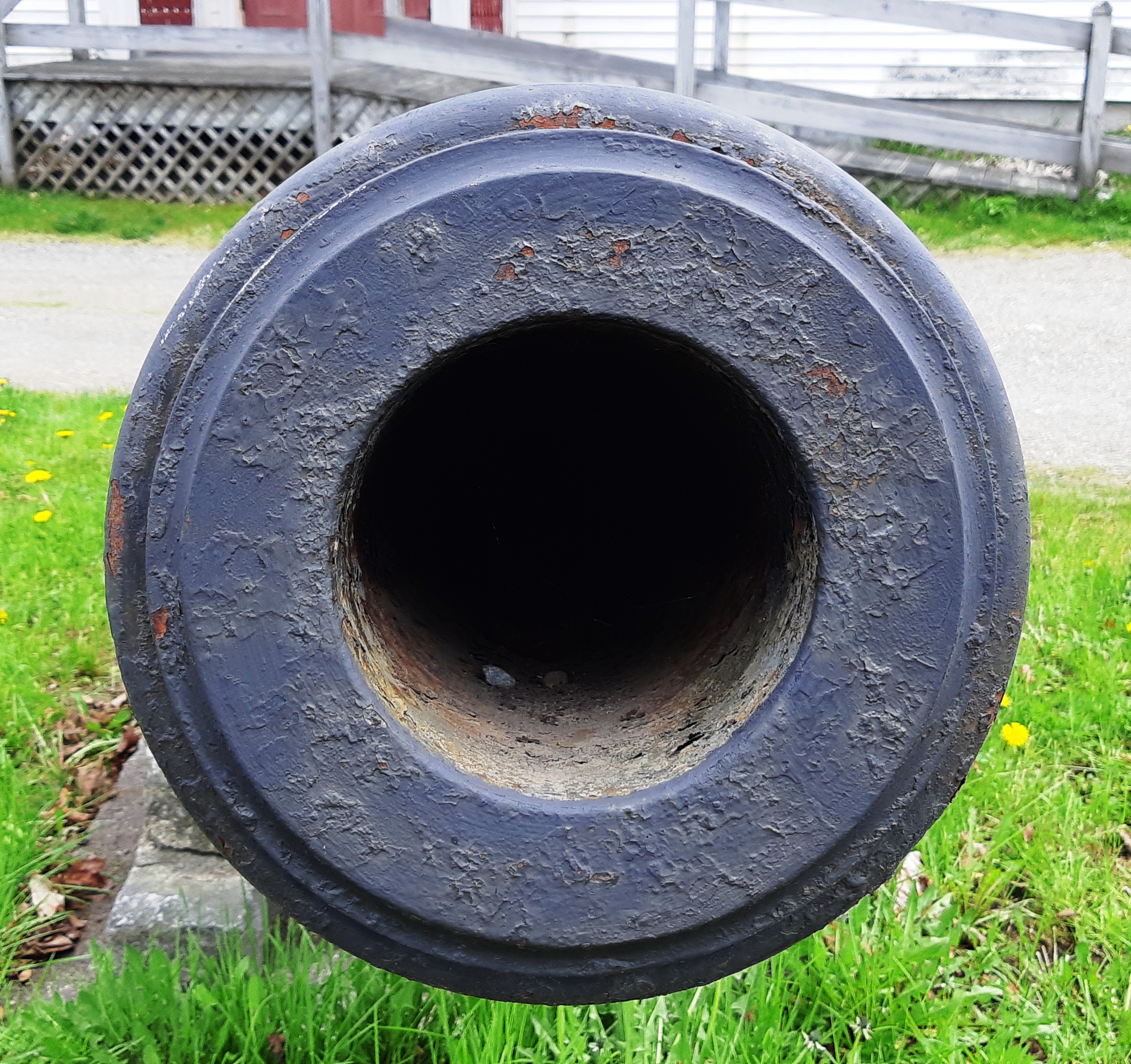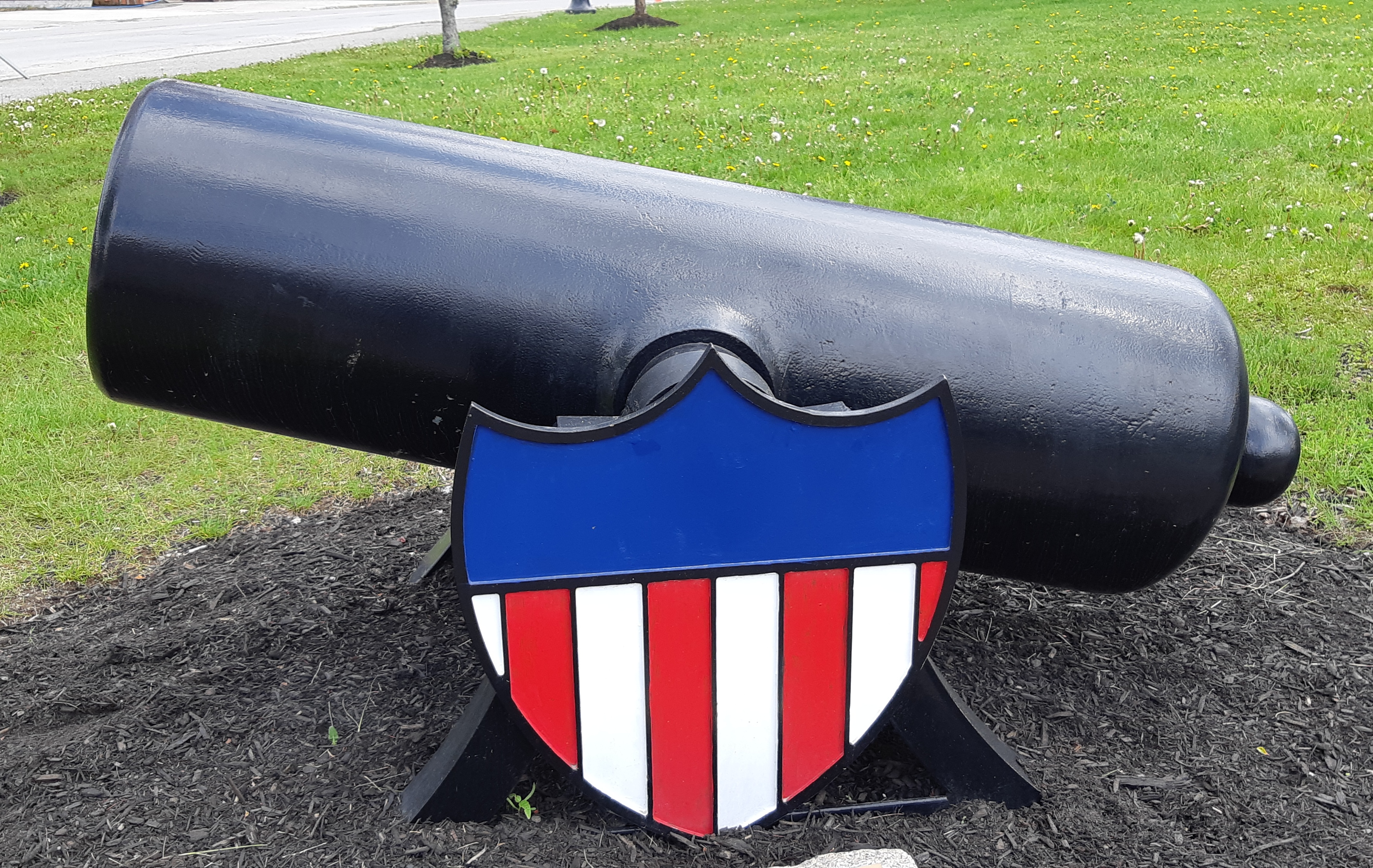 5″/51 calibre Simm Gun, 23,000-lbs.  This gun was acquired after the closure of Naval Air Station Brunswick.  Formerly located on the base next to the chapel, it is believed to have been removed from one of three ships: USS Nevada, the USS Florida or the USS Olympia.  The serial number is unreadable due to layers of paint.