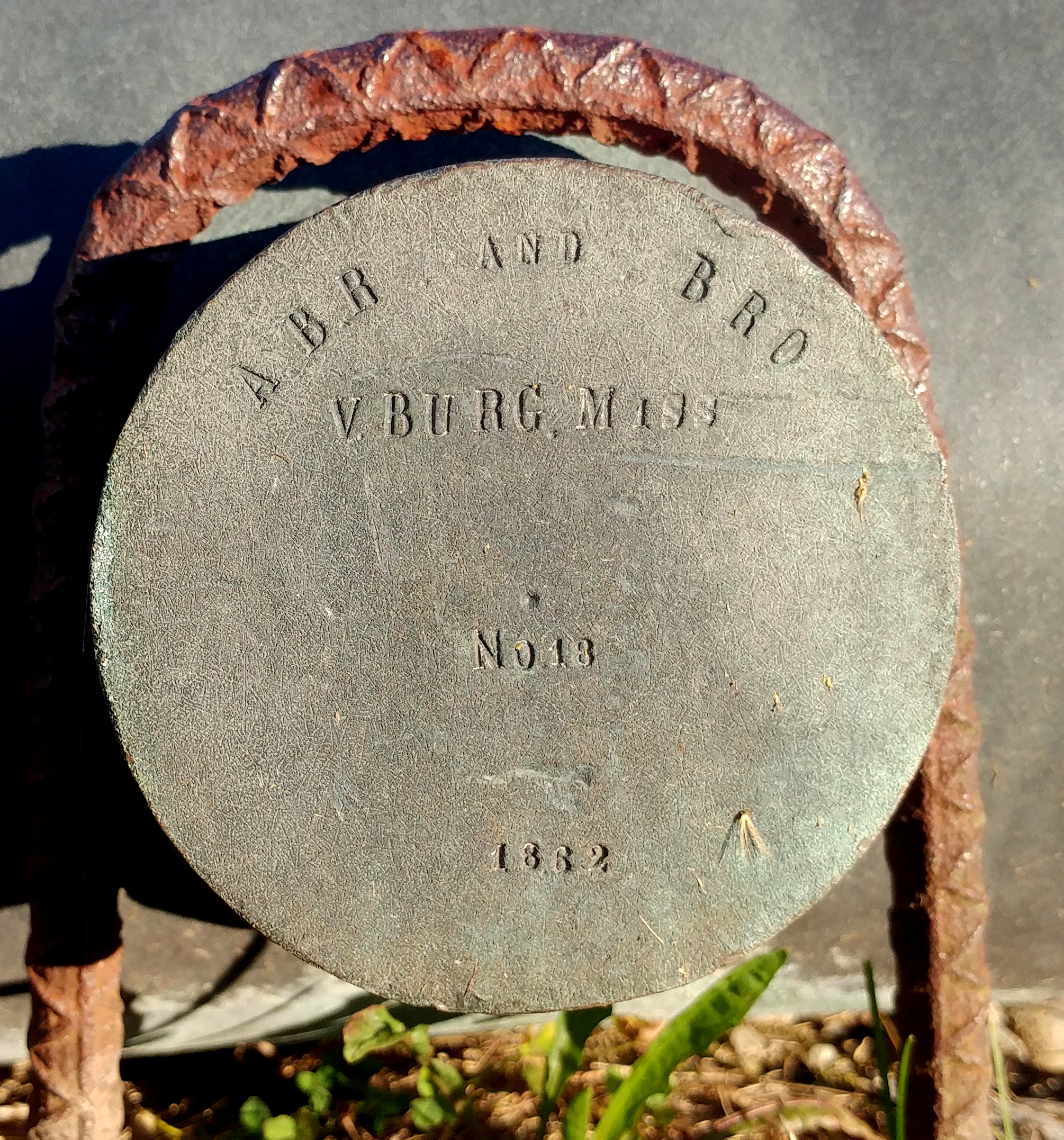 Bronze 6-pounder smoothbore muzzle-loading Gun, ABR AND BRO, VBURG.MISS, No. 18, 1862 on the left trunnion, mounted on a concrete stand, No. 2 of 4 at the base of the Civil War Memorial.