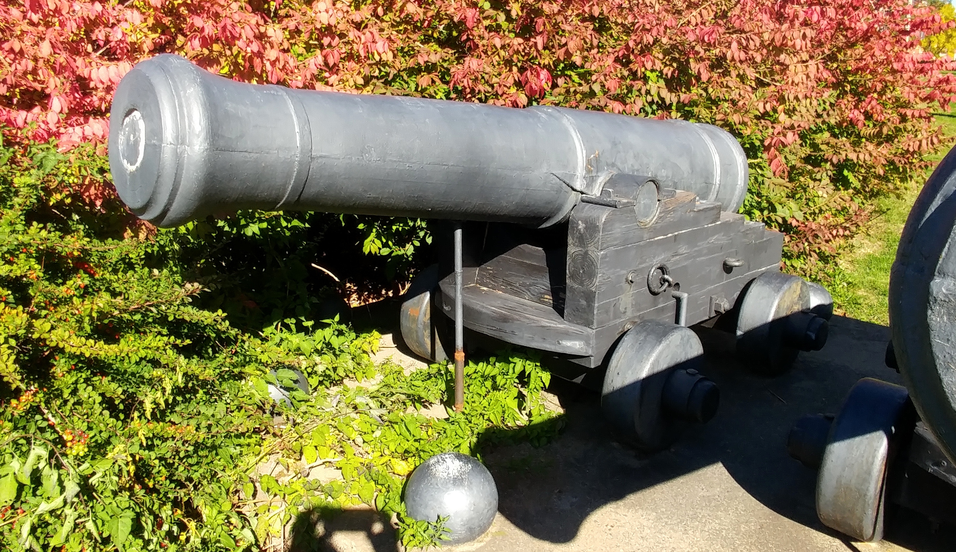 Cast-iron 24-pounder smoothbore muzzle-loading replica gun from the USS Constitution, previously mounted on a wood naval gun carriage, now mounted on a concrete stand,  No. 1 of 2.