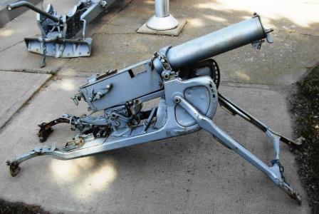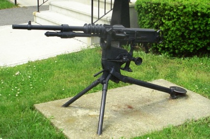 6-mm Colt-Browning M1895 as-operated machine gun, mounted on a tripod stand in front of the war memorial.