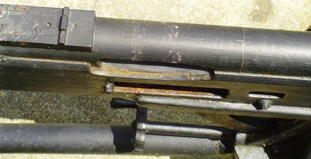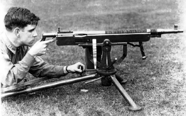 One of the later versions of the Colt-Browning M1895 machine gun is demonstrated by a US Army operator. The gun is shown mid-action, with the operating lever extending downward below the front of the barrel.
