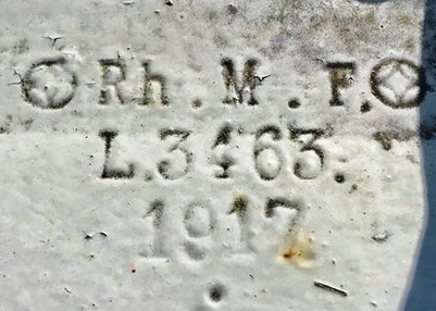 This particular piece of artillery is marked on the muzzle face, indicating that it is an Army, rather than a Navy Parrott Rifle, which were marked elsewhere. The markings on the right trunnion (RPP) stands for Robert Parker Parrott, the inventor of this style of gun. On the muzzle, starting at about the ten o’clock position and going clockwise are the markings “No 391 1865 WPF RMH 4.2 4286” which identify this gun as serial number 391, manufactured in 1865 at the West Point Foundry, inspected by Richard M. Hill, of 4.2 inch caliber (firing a 30 lb projectile), and weighing 4286 lbs. This particular piece or ordinance is one of 206 surviving 30-pdr, 4.2” Army Parrott Rifles. (Jude Seminara, Jim Bender, Jack Melton, and Bernie Paulson)