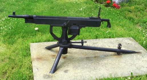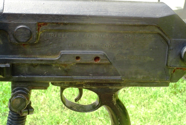 8-mm Hotchkiss Model 1914 Machine Gun, mounted on a tripod stand in front of the war memorial. The American Expeditionary Forces (AEF) in France purchased 7,000 Mle 1914 Hotchkiss machine guns in 8-mm Lebel, and used them extensively at the front in 1917 and 1918.