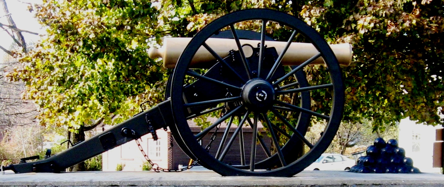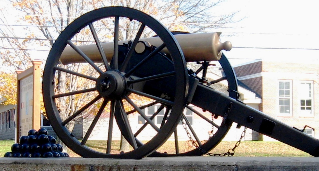 Bronze 6-pounder smoothbore muzzle-loading Gun, mounted on a wheeled iron carriage, located on the Town Common.