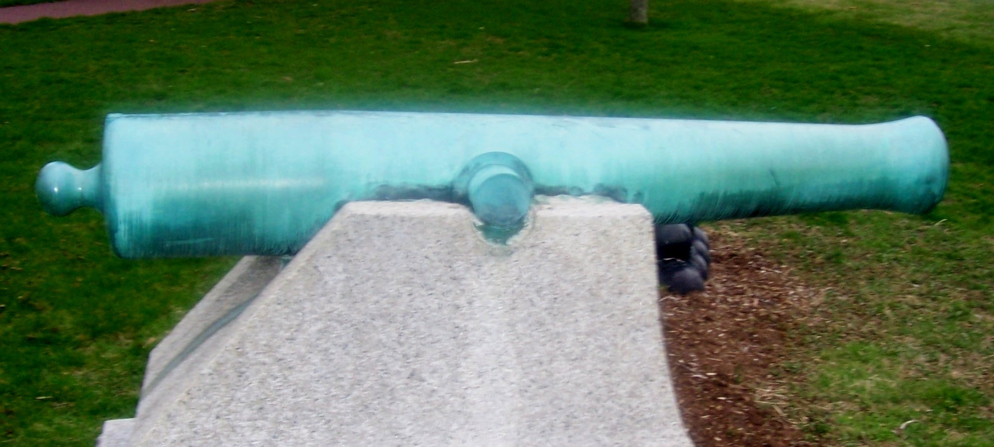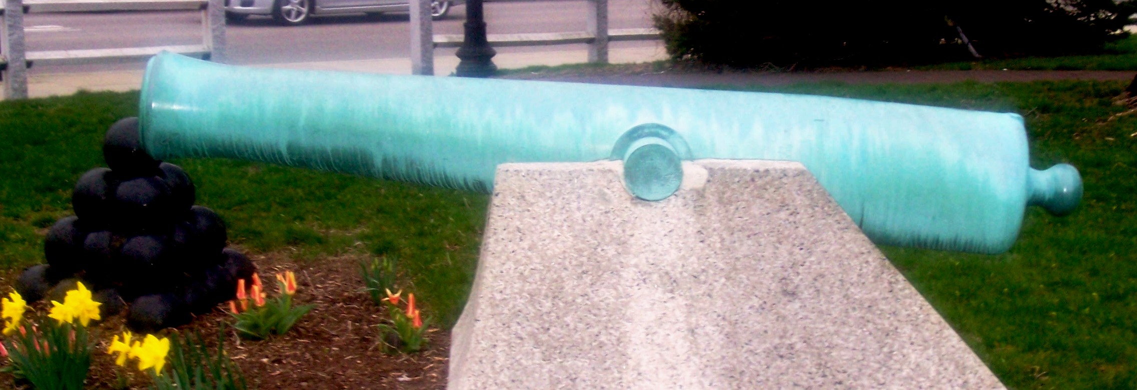 Cast Iron 24-pounder smoothbore muzzle-loading replica Gun, mounted on a wooden naval gun carriage. This gun came from the USS Constitution (made for the ship’s restoration of 1907). Inside a small park/ traffic circle by the waterfront.