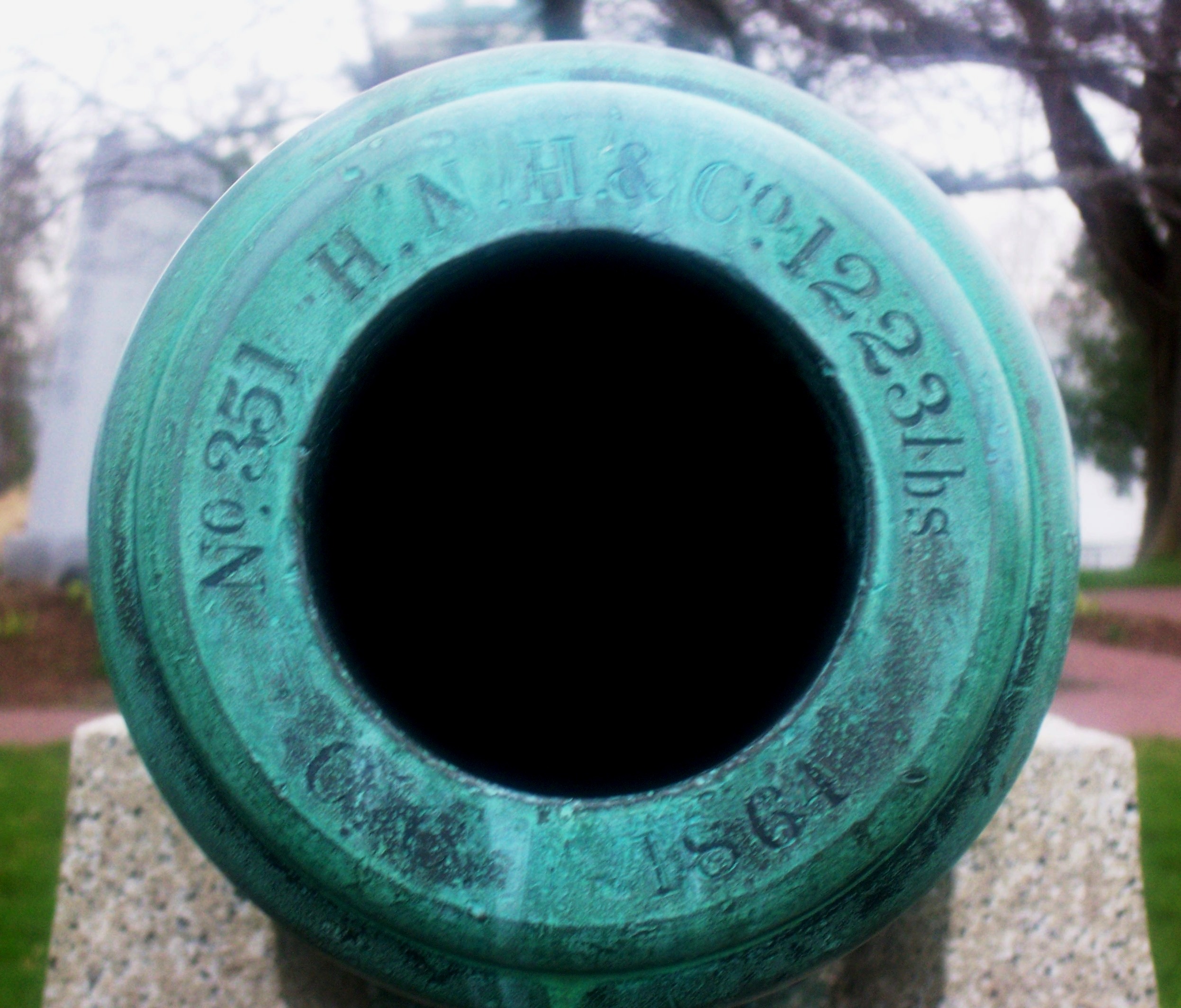 Registry Number 255 manufactured by Ames Manufacturing Company, Chicopee, Massachusetts in 1863. “J.A.D” – Inspected by John A. Dahlgren. Weight: 774 pounds. Preponderance: 75 pounds. Mounted on Carriage No. 490.OF.571.
