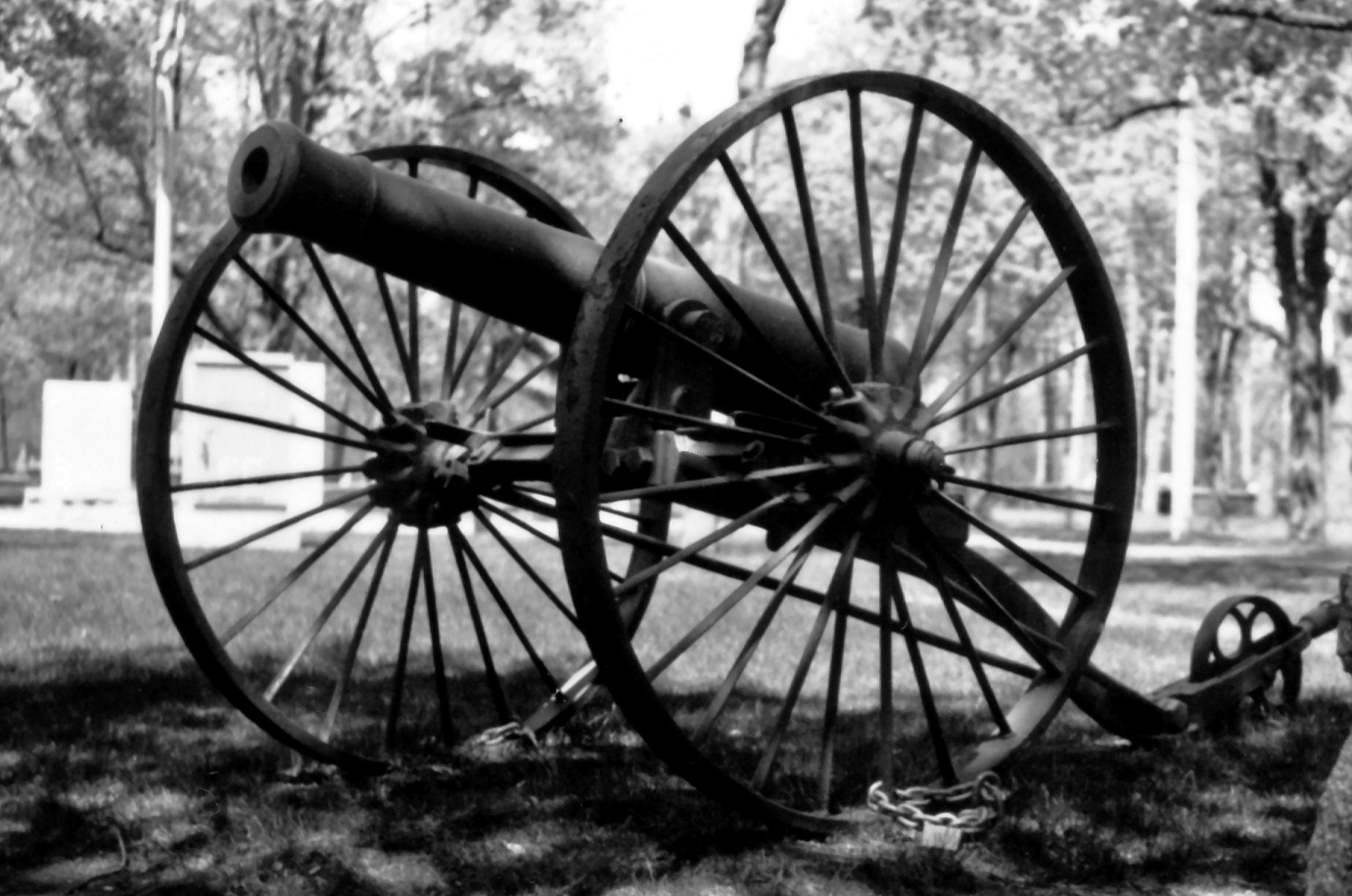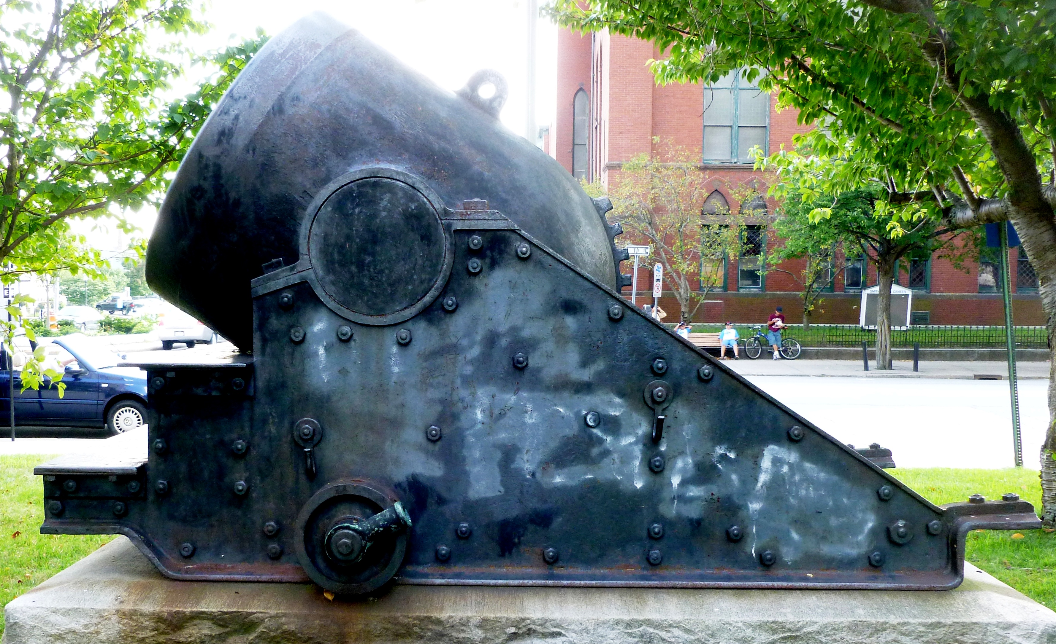 9-inch Dahlgren Shell Gun, Serial No. 199, mounted on a concrete stand in a small park in downtown Holyoke. A plaque on the gun reads: “Dahlgren Shellgun No. 199, discovered in Springdale Park May 1979, restored 1979, mounted 1980, by Holyoke, Inc. Used as broadside guns on mid-19th Century Warships, these guns could fire a 32-pound shot 1,756 yards. Obsolete by the mid-1880’s, they were given to communities for ornamental purposes”.
