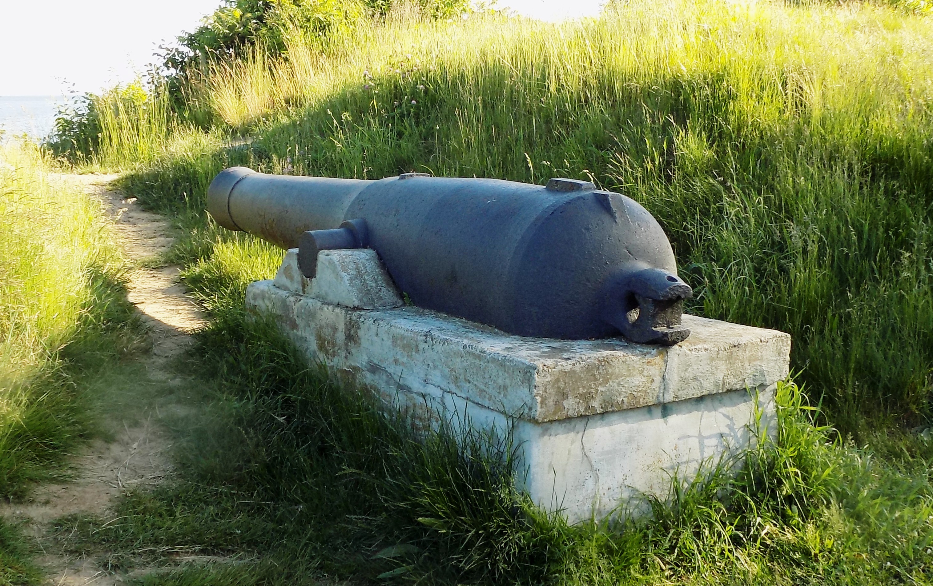 Cast Iron 24 pounder smoothbore muzzle-loading Gun, (ca. 1775 – 1815), weight (corroded), Serial No. corroded. No. 2 of 2, removed from Fort Adams in the 1980’s. Fort Revere Park.