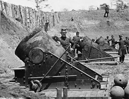 Federal Battery No. 4, 1st Connecticut Heavy Artillery, with 13-inch Seacoast Mortars, M1861, weight 17,196-lbs, during the Siege of Yorktown, Virginia, 1862.