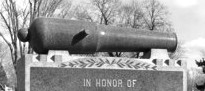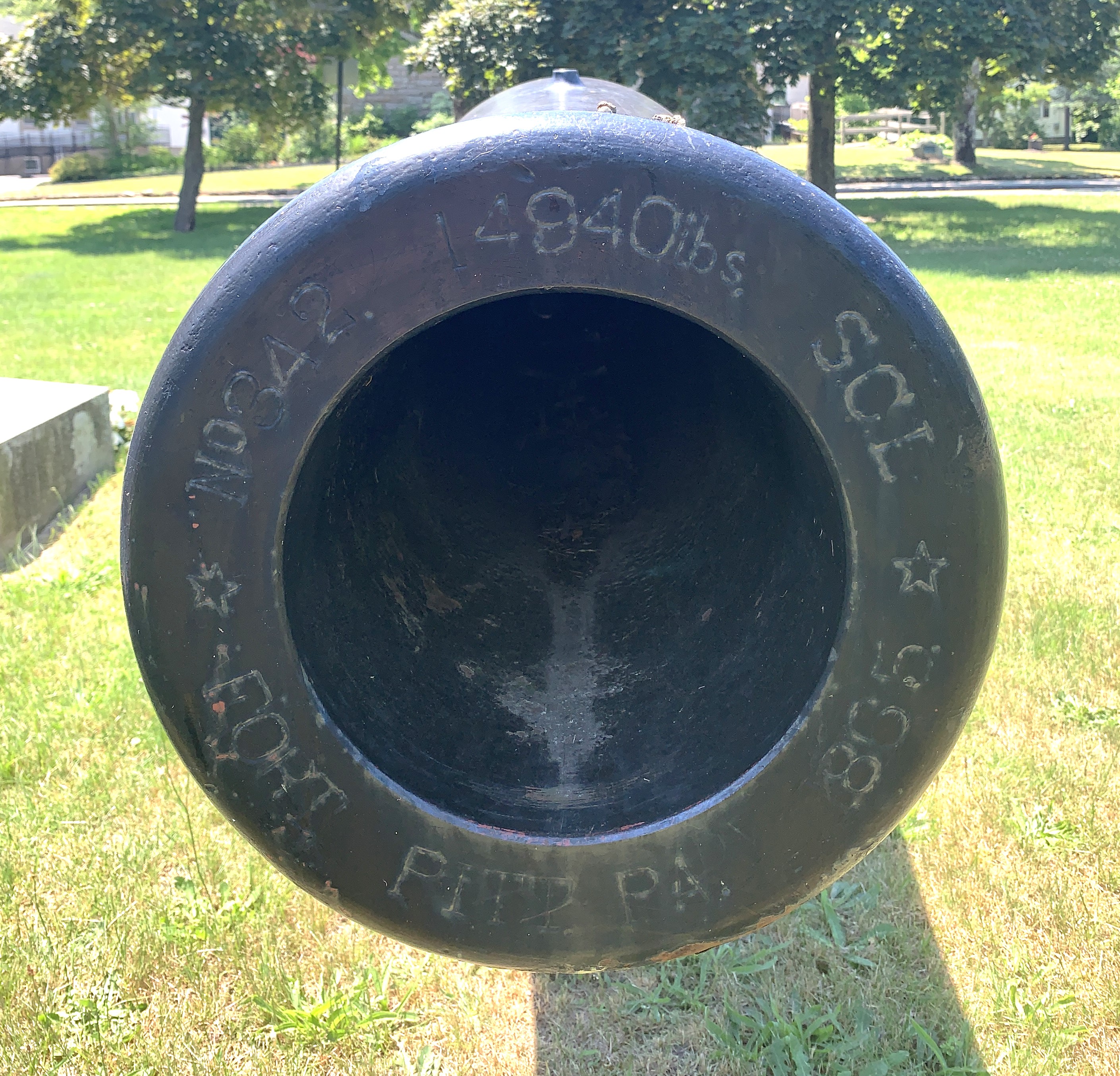10-inch Rodman Gun, (Columbiad, 10-inch, smoothbore, seacoast, M1861), weight 15,204-lbs, 1864, 36. M.S. S.Mca.M. & Co. No. 1 of 2. Veterans Memorial, Main Street and Gibbs Avenue.