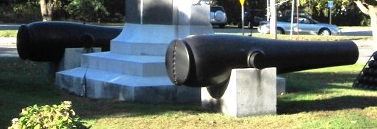 Blomefield 18-pounder smoothbore muzzleloading Gun, weight unknown, (Serial No. 75347, CARRON, 1809) on left trunnion, (18P) on right trunnion, mounted on a concrete stand on the Town Common. This gun is a trophy from Moro Castle, at the entrance of Santiago Harbor, Cuba, taken 17 July 1898.