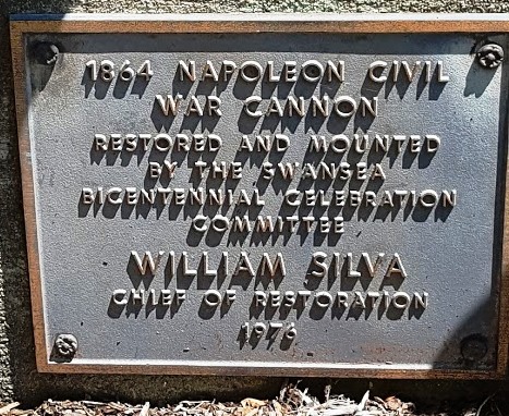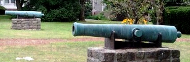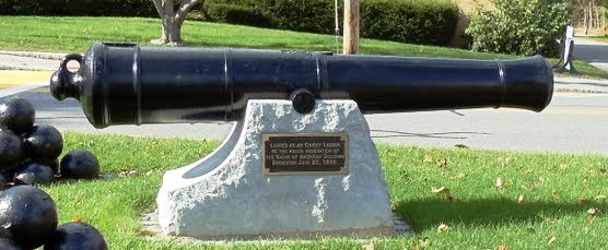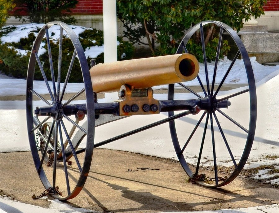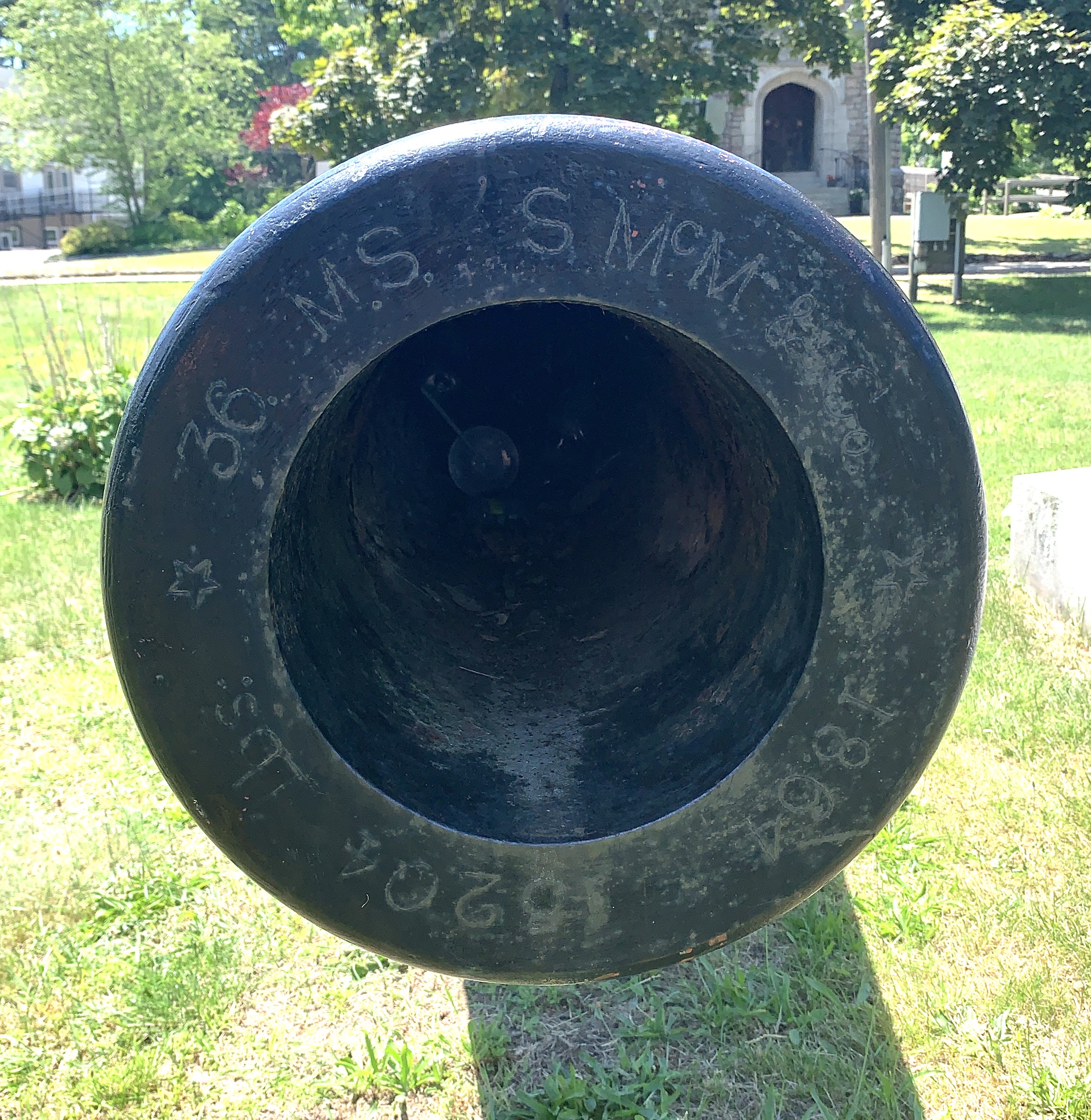 Dahlgren bronze 12-pounder smoothbore muzzle-loading Boat Howitzer, No. 1 of 2. Located in front of the Town Hall. These two are smoothbore 12-Pounder Boat Howitzers (4.62-Inch Bore). A third one is a Rifled 12-Pounder Boat Howitzer (3.4-Inch Bore), inside the town hall.