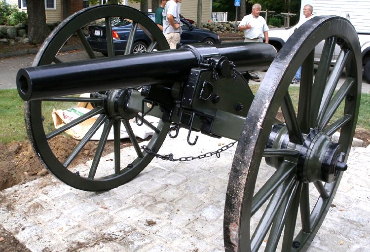3-inch Ordnance Rifle M1861, cast in 1863, mounted on a wheeled wooden gun carriage, standing in front of the GAR Hall on Country Way.
