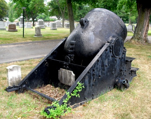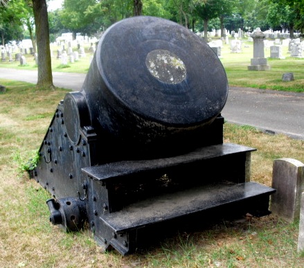13-inch Seacoast Mortar, M1861, Reg. No. 1188, Fdy No. 1188, weight 17,124-lbs, located in St. Michael’s Cemetery in Springfield, with a plaque attached honoring the brave men who fought in the Civil War. The mortar was cast at the Fort Pitt Foundry (PA) in 1862. There is an anchor insignia on the piece which suggests it was once used by the Union Navy. Located in the Springfield-St. Michael’s Cemetery, it was placed there by the E. K. Wilcox Post 16 of the GAR. A newspaper article from 4 Dec 1902 states that this mortar was in the cemetery at that time and had been brought from the Portsmouth, NH Navy Yard.