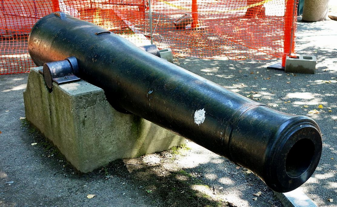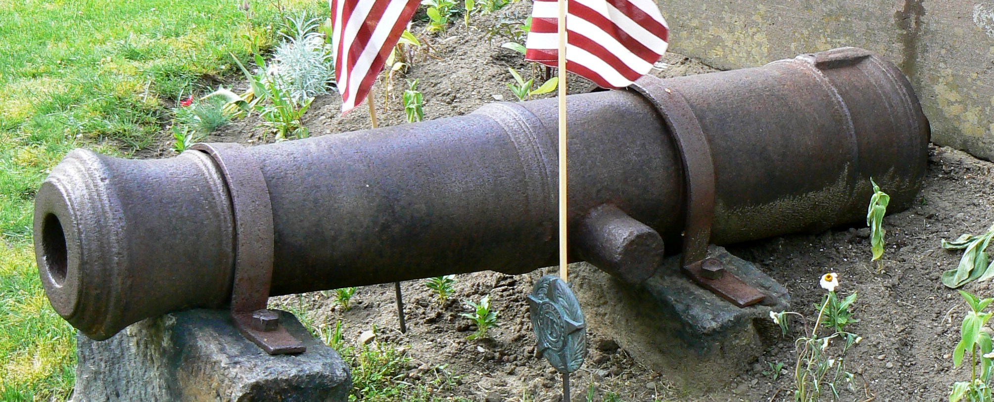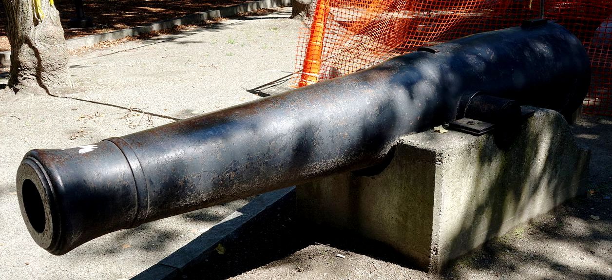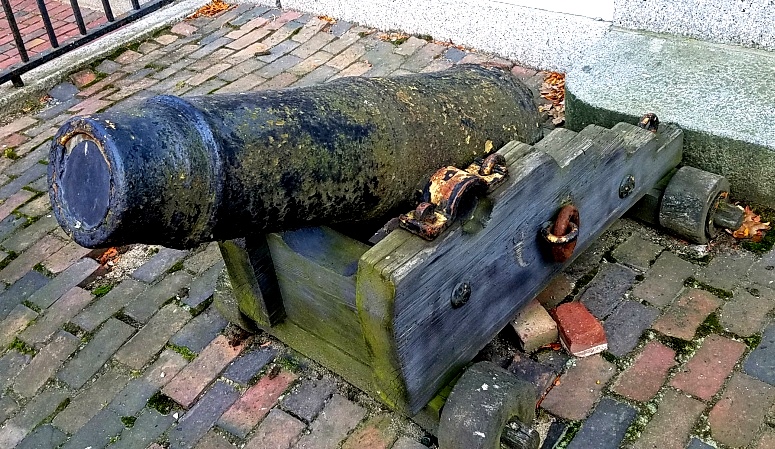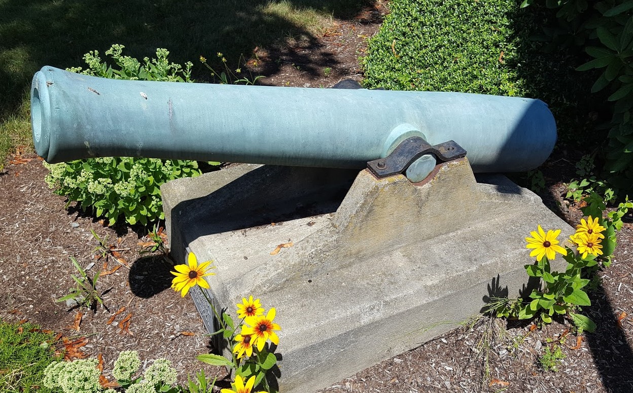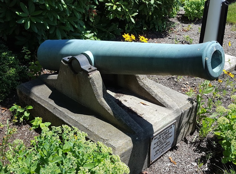 Cast Iron 24-pounder smoothbore muzzle-loading replica Gun, mounted on a wooden naval gun carriage. This gun came from the U.S.S. Constitution (made for the ship’s restoration of 1907). Scituate Federal Savings Bank.
