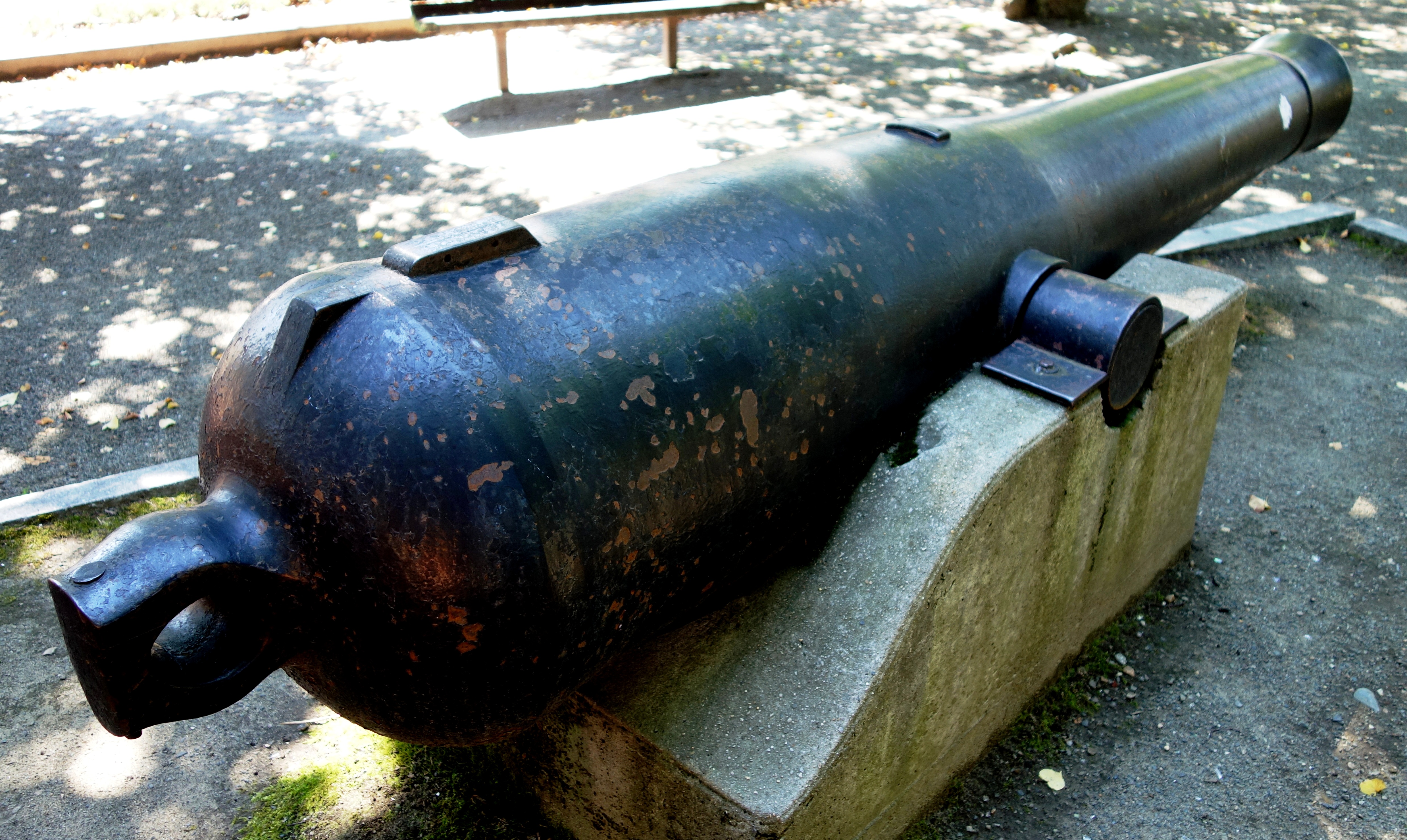 Cast Iron 32-pounder Gun, 57 cwt smoothbore muzzle-loading Navy Gun (Serial No. 520–), made by Cyrus Alger and Co. in South Boston, MA, in 1849. The inspector was AAH, most probably Alexander Harwood, a naval officer. No. 1 of 2.