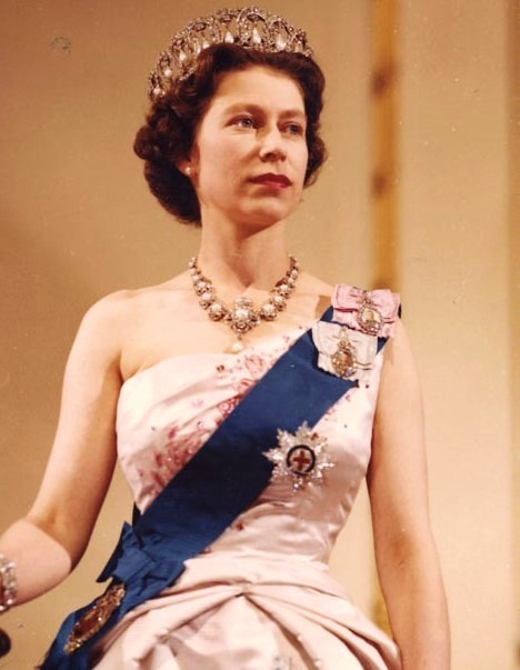Queen Elizabeth II wearing the Vladimir Tiara, the Queen Victoria Jubilee Necklace, the blue Garter Riband, Badge and Garter Star and the Royal Family Orders of King George V and King George VI.