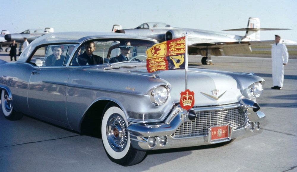 Queen Elizabeth and Prince Philip are driven along the runway line with RCAF CF-100 Canuck fighters, en route to Rideau Hall, Ottawa, Ontario, 12 October 1957.