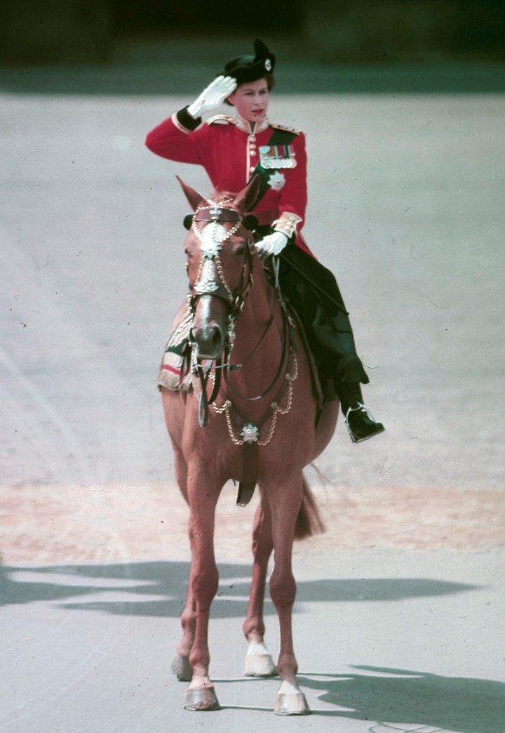 Her Majesty Queen Elizabeth II taking the salute in ceremony of Trooping the Colour. Trooping of the Colour c,1953. Her Majesty is wearing the uniform of the Grenadier Guards and is riding a Metropolitan Police horse named “Imp”. Her favorite horse was named “Burmese”, a gift from the RCMP.