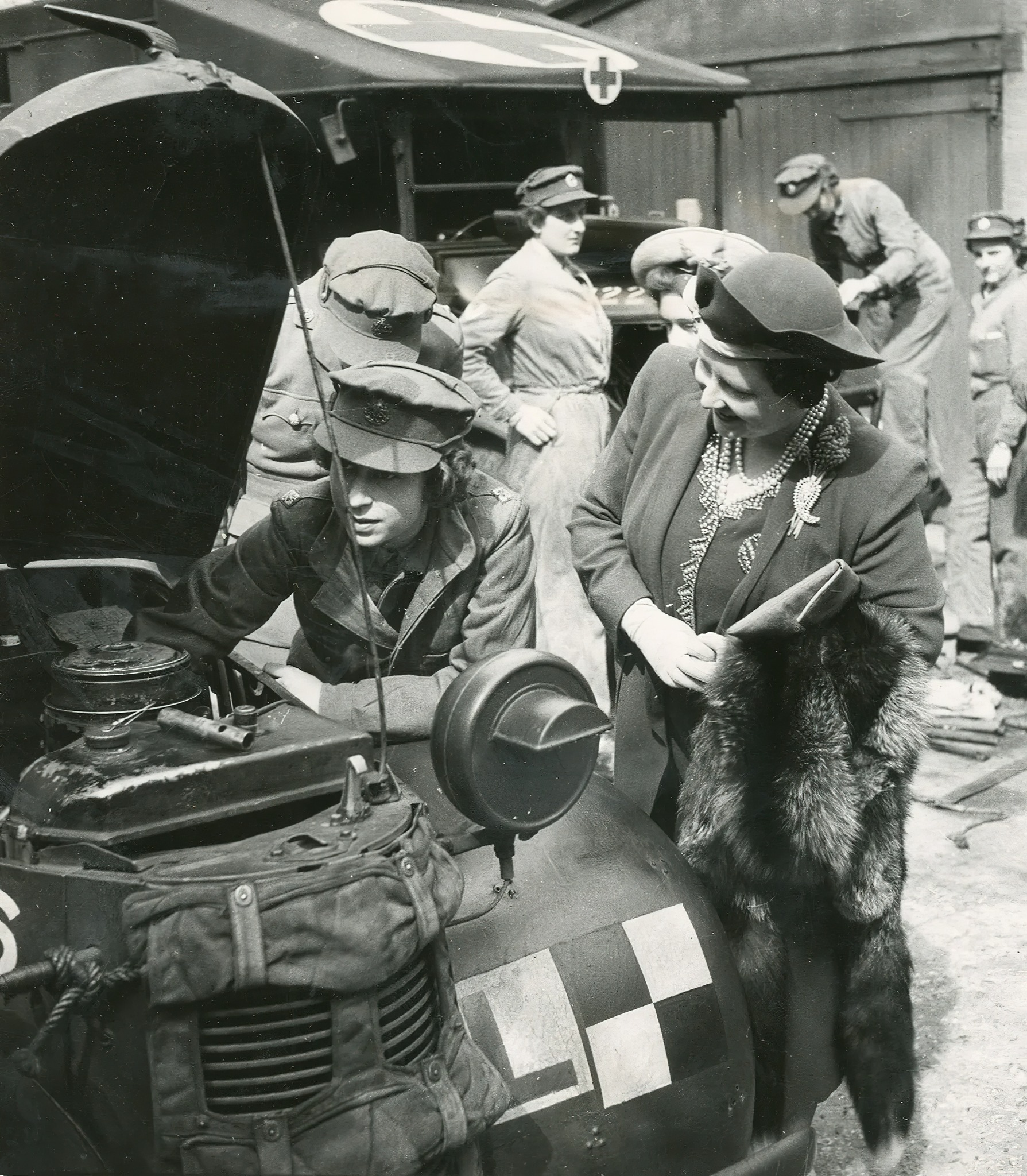 Princess Elizabeth explaining to the Queen what she has done to the car engine in April, 1945 during her service in the Second World War.