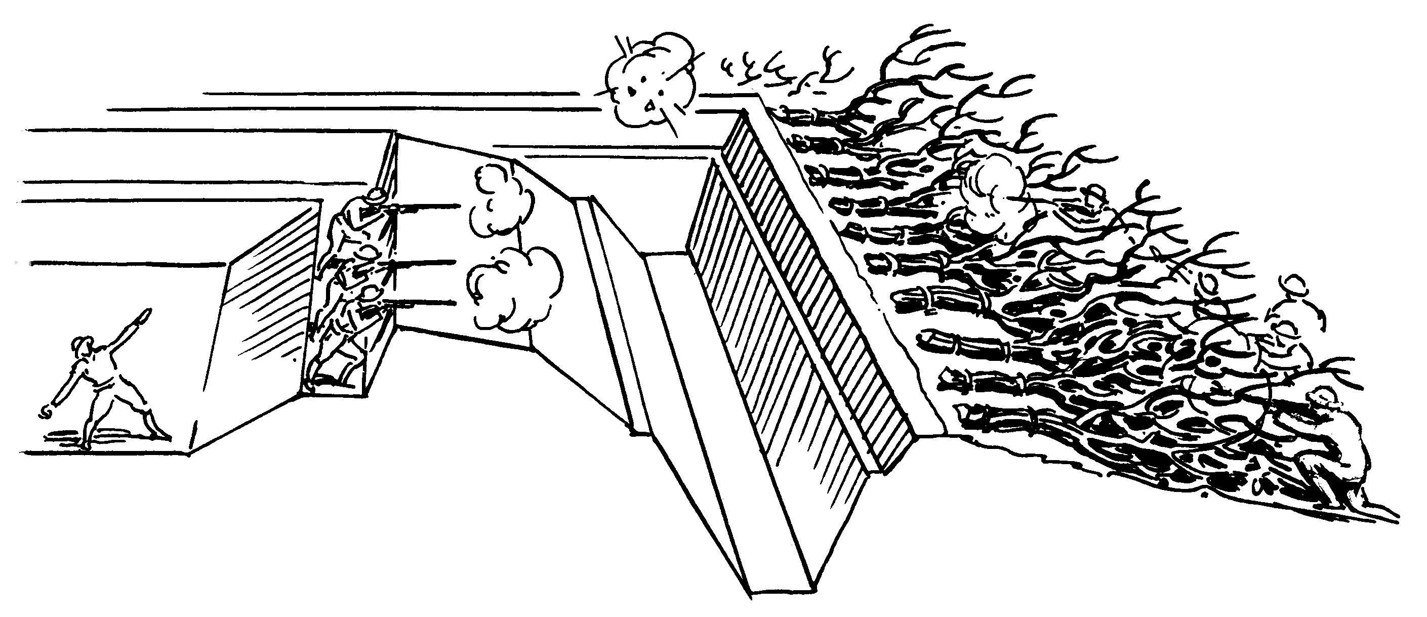 Since the beginning of time, man has sought to defend himself and his family by finding a shelter or building a strong fortification. In equal measure and determination there have been those who have sought to overcome these defenses, which generally consisted of three different methods of protective works. The earliest and most simple field fortifications often consisted of stakes, stones, ditches, abatis (an obstacle comprised of cut trees with their branches facing the enemy), and other common obstacles constructed just before a battle began and which were primarily only intended for temporary or immediate use during a battle. The techniques used often mirrored the basic techniques used by early hunters, who built obstacles whose design and implementation were derived from simple but effective pits and traps which had been used to catch animals. As attack methods grew in sophistication, more ingenious ideas and methods of defense came to be employed.