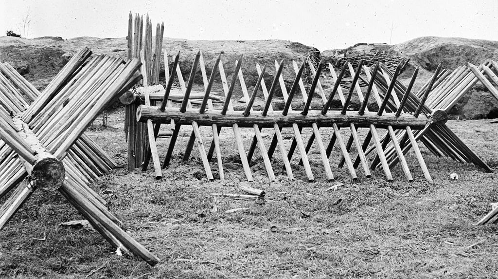 Chevaux-de-frise used in the defence of the Confederate Fort Mahone at the Siege of Petersburg, Virginia, fought from 15 June 1864, to 2 April 1865, during the American Civil War. The campaign consisted of nine months of trench warfare in which Union forces commanded by Lieutenant-General Ulysses S. Grant assaulted Petersburg unsuccessfully and then constructed trench lines that eventually extended over 30 miles (48 km) from the eastern outskirts of Richmond, Virginia, to around the eastern and southern outskirts of Petersburg. Petersburg was crucial to the supply of Confederate General Robert E. Lee’s army and the Confederate capital of Richmond. Numerous raids were conducted and battles fought in attempts to cut off the Richmond and Petersburg Railroad. Many of these battles caused the lengthening of the trench lines. Lee finally gave in to the pressure and abandoned both cities in April 1865, leading to his retreat and surrender at the Appomattox Court House. The Siege of Petersburg foreshadowed the trench warfare that was common in the First World War, earning it a prominent position in military history.