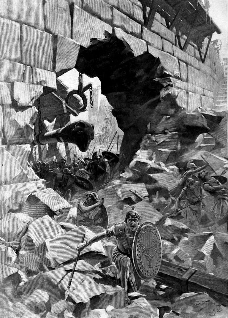 Cyrus offered large rewards to the first soldiers who should ascend the battlements (top of a protective wall); but repeated Persian attacks were repulsed with loss. According to Herodotus, the city ultimately fell by the agency of a Persian soldier, who climbed up a section of the walls which was neither adequately garrisoned, nor protected by the ancient rites which had dedicated the rest of the cities’ defenses to impregnability; the steepness of the adjoining ground outside the walls was responsible for this piece of Lydian Hubris. Hyroeades, the Persian soldier, saw a Lydian soldier climbing down the walls to retrieve a dropped helmet, and tried to follow the example. The success of his ascent set the example to the rest of Cyrus’ soldiers and these swarming over the exposed wall and the city was promptly taken.