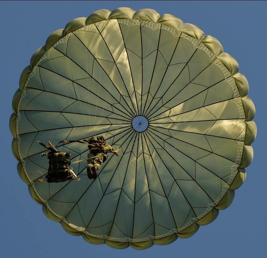About 300 above the ground, each jumper lowers his rucksack by pulling a special release tab, which lets it drop to hang about 15 feet below him. It will swing somewhat, but if it is really dark, he will feel it thump first and have some warning of when he needs to prepare to make contact with the ground. He keeps his feet and knees together and his elbows in tight as he prepares to hit and roll, arcing his body in the direction he is swinging and hopefully not landing too hard or on anything sharp.
