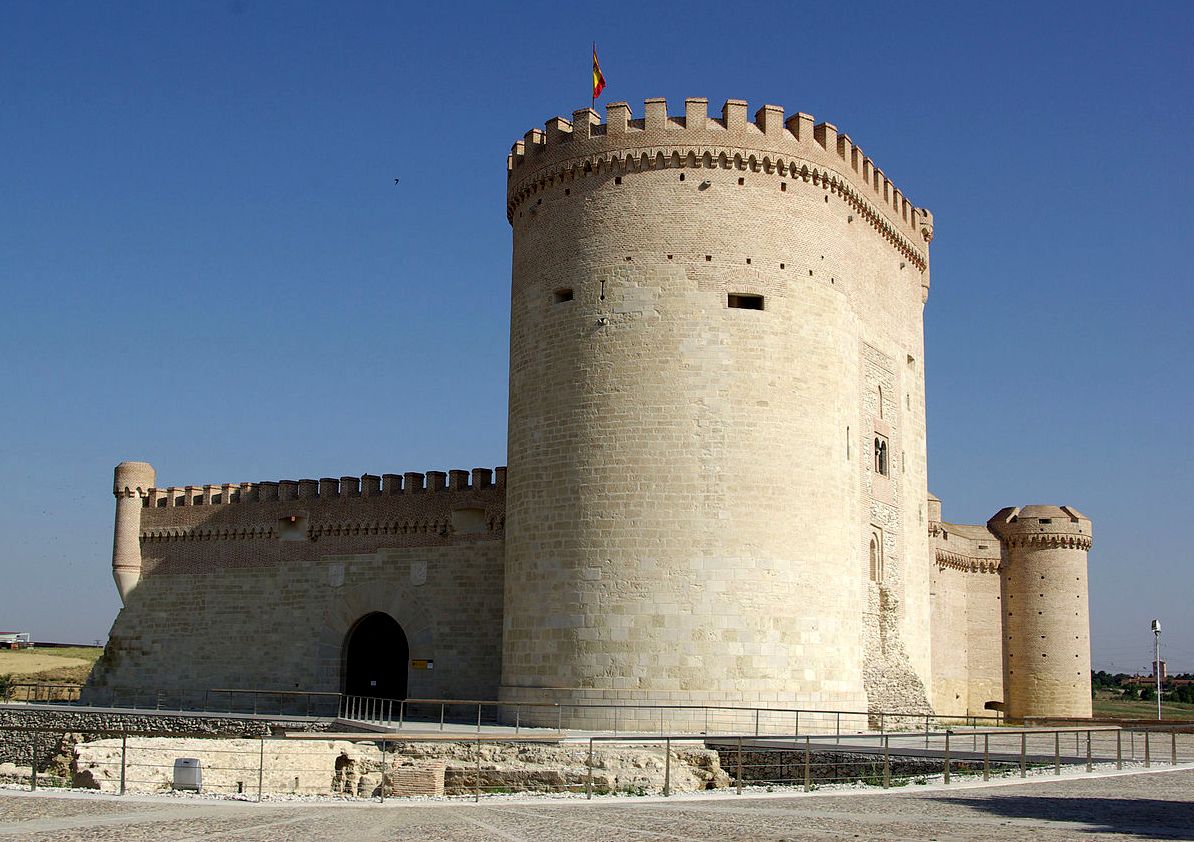 Castle of Arévalo (Castillo de Arévalo), built between the 12th and 16th centuries in the north of the province of Avila in Spain. The ground plan is almost square, round towers at its corners, round sentry boxes on its walls and the large D-shaped keep in one corner. The keep is made of ashlar masonry with later brick additions similar to the rest of the castle.