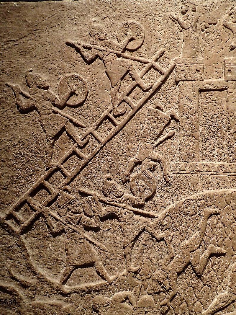 Assyrians using siege ladders in a relief of attack on an enemy town during the reign of Tiglath-Pileser III 720-738 BCE from his palace at Kalhu (Nimrud). (British Museum collection, gypsum relief on loan to the Getty Villa)