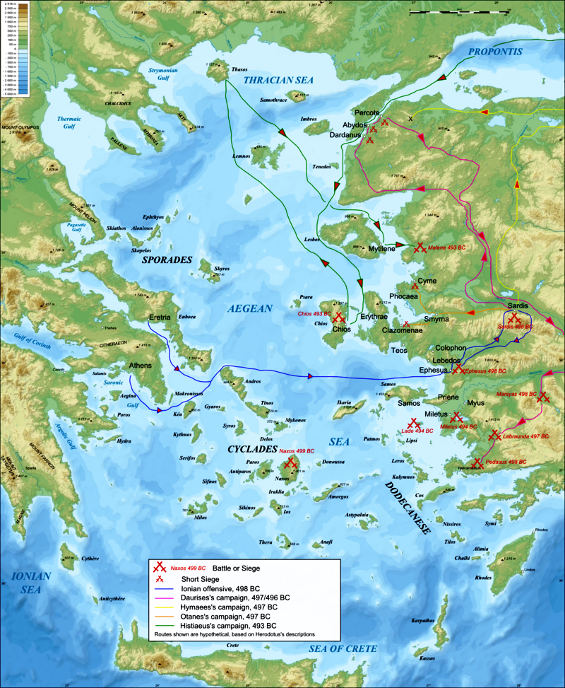 In the aftermath of this disastrous expedition, and sensing his imminent removal as tyrant, Aristagoras chose to incite the whole of Ionia into rebellion against Darius the Great. The revolt then spread to Caria and Cyprus. Three years of Persian campaigning across Asia Minor followed, with no decisive effect, before the Persians regrouped and made straight for the epicentre of the rebellion at Miletus. At the Battle of Lade, the Persians decisively defeated the Ionian fleet and effectively ended the rebellion. Although Asia Minor had been brought back into the Persian fold, Darius vowed to punish Athens and Eretria, who had supported the revolt. In 492 BC therefore, the first Persian invasion of Greece, would begin as a consequence of the failed attack on Naxos, and the Ionian Revolt. (Herodotus. The Histories, Penguin Books, 1983)