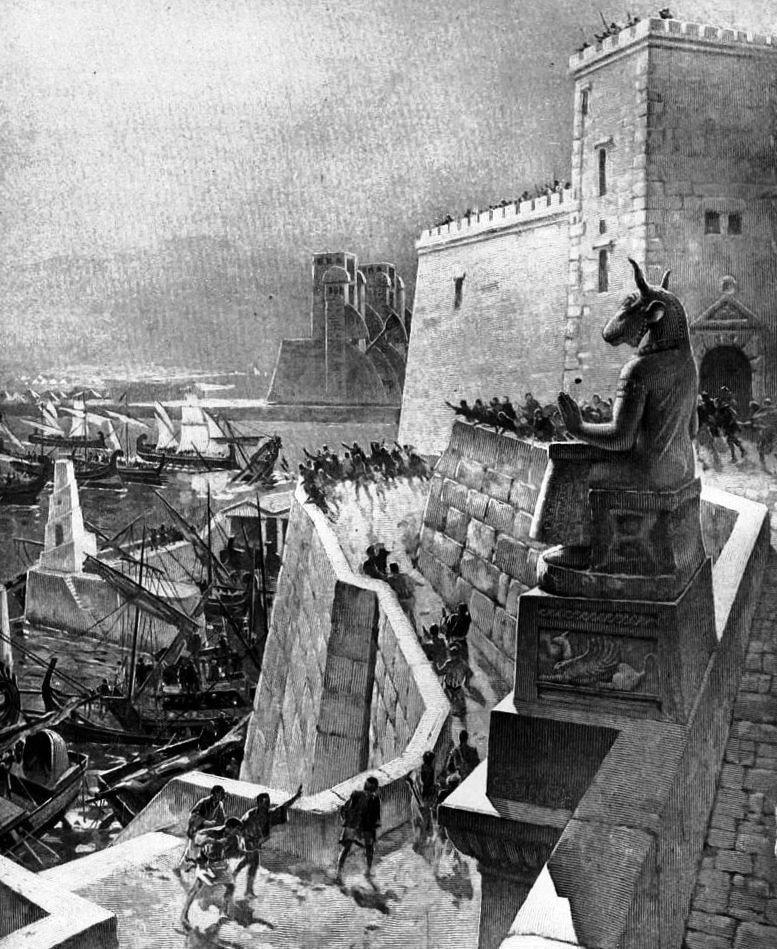 Alexander reportedly had a dream that Tyre would fall to him, and as a result, he launched his final assault on the fortress. He ordered his triremes to sail against both the “Sidonian” and “Egyptian” ports simultaneously, with object being to force an entrance. They succeeded in gaining access to both harbors and captured the Tyrian ships. Alexander’s ships then closed in on the city from all sides and when they were close enough, siege bridges were thrown over the walls from his vessels. Macedonian soldiers quickly ran across the siege bridges, and advanced through breaches in the walls where they engaged and quickly dispatched or fought off the Tyrian defenders.