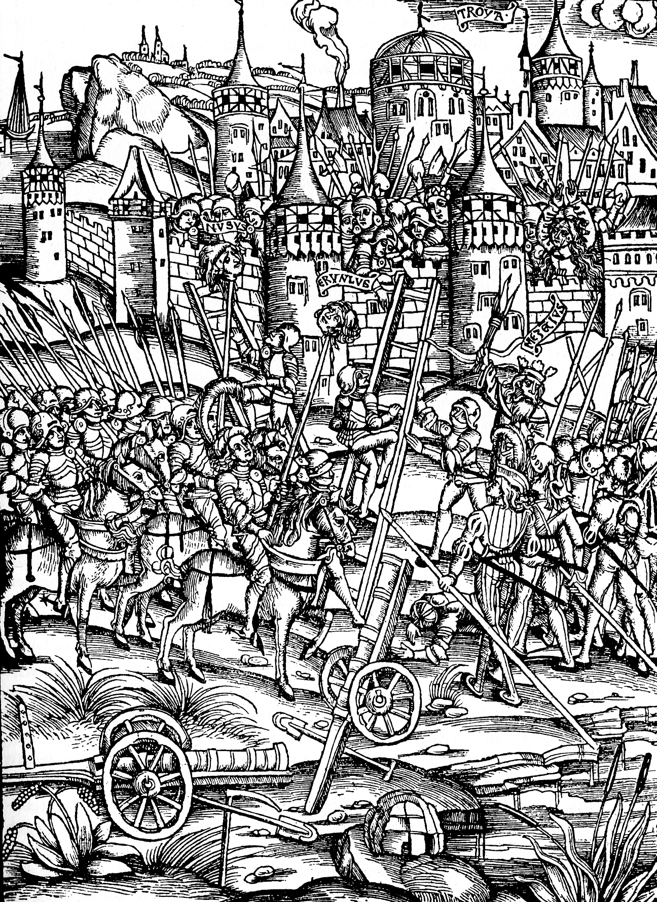 Engraving of the Siege of Troy, but depicting the scene as it would have appeared at Holschnitt, Germany, 1502.