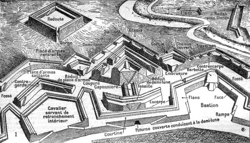 Engraving showing Bastions and elements of fortifications from the Vauban era.