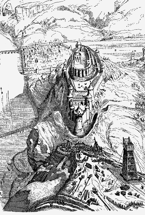 An impression by Eugène Viollet-le-Duc, a 19th-century architect experienced in renovating castles, of how the Siege of Château Gaillard would have looked.