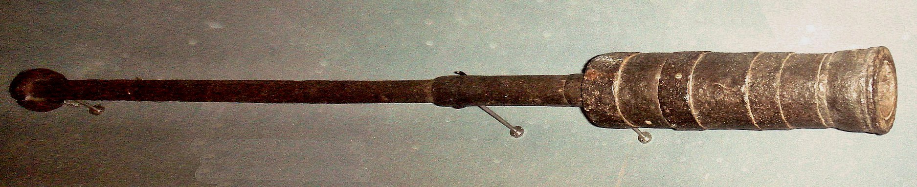 Simple handguns first began to appear in the second quarter of the 14th century, in the form of short tubes of brass or iron closed at one end.  Near the closed end, the breech was pierced by a small hole through which the charge could be fired with a piece of burning slow-match or tinder.  This barrel could be fixed to the end of a wooden staff and aimed rather roughly, by tucking it under the arm, or by supporting it on a rest.  In either case, the rear end of the staff could be stuck into the ground to take the recoil.[158]