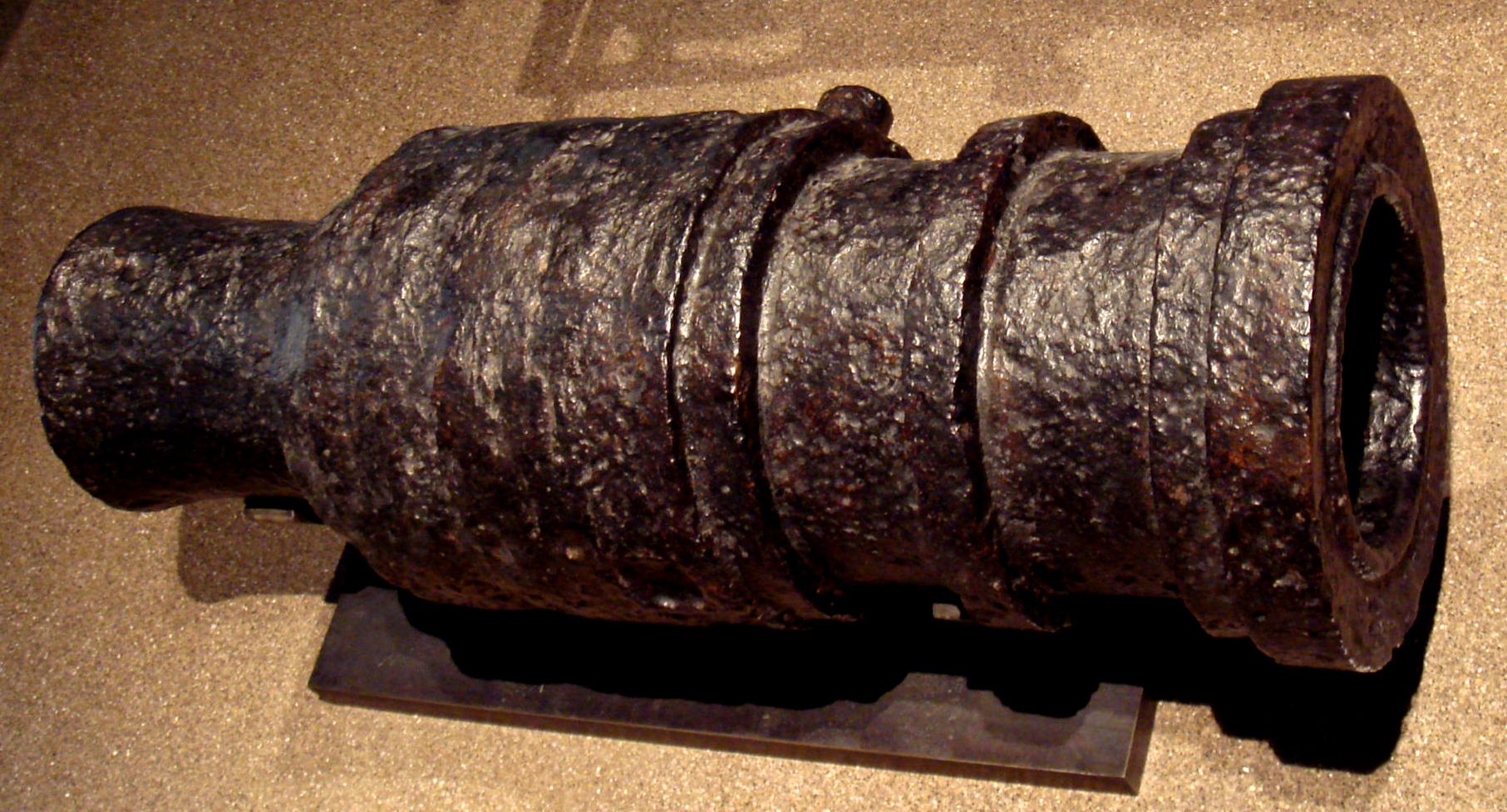 200 kg wrought iron bombard, circa 1450, Metz, France.  It was manufactured by forging together iron bars, held in place by iron rings.  It fired 6 kg stone balls.  Length: 82 cm.