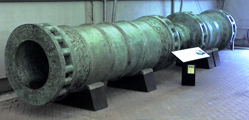 The Dardanelles Gun, a very heavy 15th-C bronze muzzle-loading cannon of type used by Turks in the siege of Constantinople in 1453, showing ornate decoration.  It is currently on display at Fort Nelson, Hampshire, UK.  (The Land Photo)