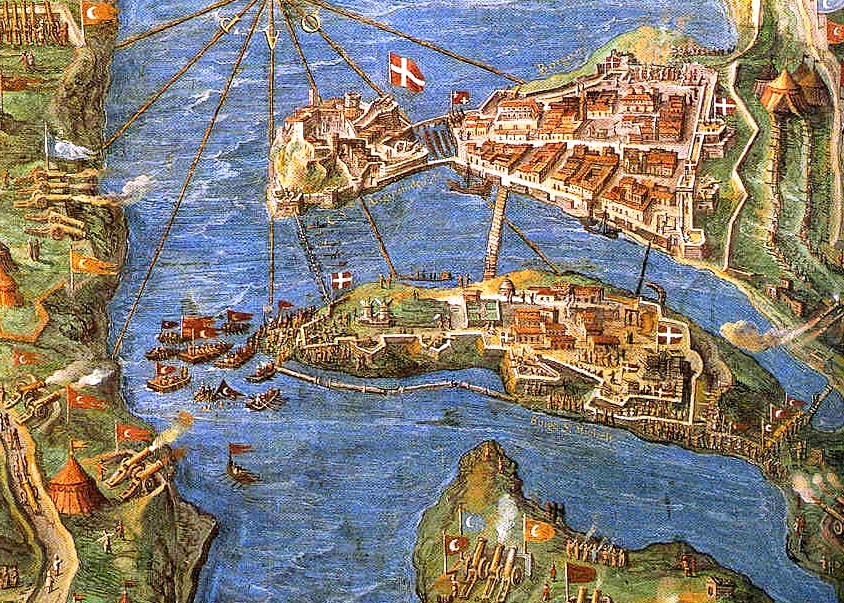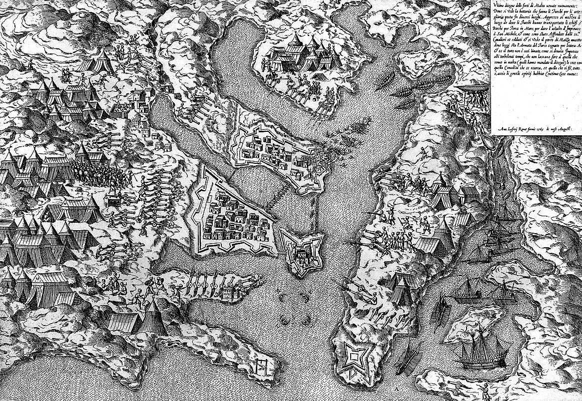 The Great Siege of Malta took place in 1565 when the Ottoman Empire tried to invade the island of Malta, then held by the Knight’s Hospitaller.  The Knights, with approximately 2,000 footsoldiers and 400 Maltese men, women and children, withstood the siege and repelled the invaders.  This victory became one of the most celebrated events in sixteenth-century Europe.  The siege was the climax of an escalating contest between a Christian alliance and the Islamic Ottoman Empire for control of the Mediterranean, a contest that included the Turkish attack on Malta in 1551, the Ottoman destruction of an allied Christian fleet at the Battle of Djerba in 1560, and the decisive Battle of Lepanto in 1571.