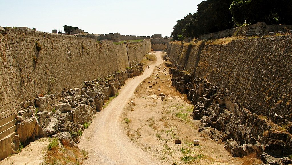 Constantinople had been heavily fortified since the sixth century with a strong system of triple walls, augmented with a moat 60 feet wide and 20 feet deep.  The moat could be filled with water, which was piped from distant hills, although it was generally used as a dry ditch.  Behind the scarp, a battlemented wall six feet high was constructed to provide cover for archers.  Sixty feet behind this obstacle rose another wall 27 feet high, which was studded with 96 towers, which projected over the wall in such a manner that they were able to permit flanking fire.  These towers were spaced 180 feet apart, and varied in height from 30 to 35 feet above the wall.