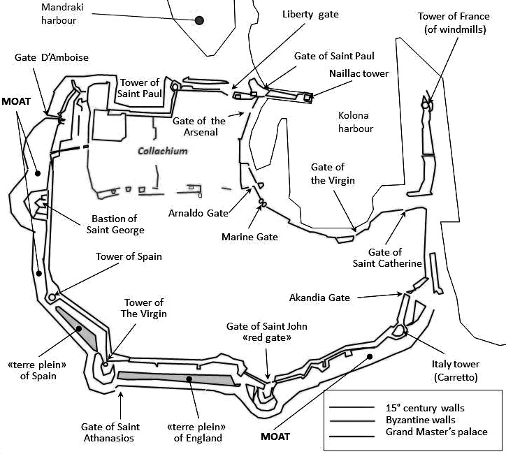 The tower of St. John at the East end of the English sector.  The tower was built under Grand Master Antonio Fluvian (1421–37), and it had a gate.  Later a barbican was built around it under Grand Master Piero Raimundo Zacosta (1461–67).  Finally the large pentagonal bulwark was built in front of it c. 1487, and the gate was removed.