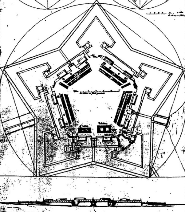 Palmanova, Italy, was planned as an 18-point star. Palmanova was founded on October 1593 by the superintendent of the Venetian Republic. The city’s founding date commemorated the victory of the Christian forces (supplied primarily by the Italian states and the Spanish kingdom) over the Ottoman Turks in the Battle of Lepanto in 1571, during the War of Cyprus. Also honored on 7 October was Saint Justina, chosen as the city’s patron saint. Using all the latest military innovations of the 16th century, this small town was a fortress in the shape of a nine-pointed star, designed by Vincenzo Scamozzi. Between the points of the star, ramparts protruded so that the points could defend each other. A moat surrounded the town, and three large, guarded gates allowed entry. The construction of the first circle, with a total circumference of 7 kilometres (4 mi), took 30 years. Marcantonio Barbaro headed a group of Venetian noblemen in charge of building the town, Marcantonio Martinego was in charge of construction, and Giulio Savorgnan acted as an adviser. The second phase of construction took place between 1658 and 1690, and the outer line of fortifications was completed between 1806 and 1813 under the Napoleonic domination. The final fortress consists of: nine ravelins, nine bastions, nine lunettes, and eighteen cavaliers.In 1815 the city came under Austrian rule until 1866, when it was annexed to Italy together with Veneto and the western Friuli. Until 1918, it was the one of easternmost towns along the Italian-Austro Hungarian border and during the First World War the city worked as a military zone hosting even a hospital for the royal army. In 1960 Palmanova was declared a national monument. (John Rigby Hale, “Renaissance war studies”, (London Hambledon Press, 1983), pg. 18.