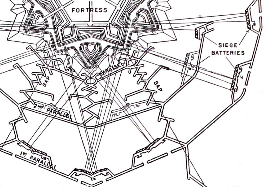 Clampe’s map of the siege of Newark (6 March 1645 – 8 May 1646) showing in green a sap that allows Roundhead siege artillery to be placed closer to the fortifications of Newark than the circumvallation. Notice that the lines of advance of the zigzag are at such an angle and position that the defenders were unable to bring enfilade fire to bear.
