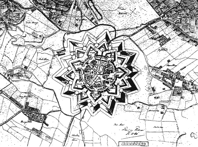The city of Coevorden was captured from the Spanish in 1592 by a Dutch and English force under the command of Maurice, Prince of Orange.  The following year it was besieged by a Spanish force but the city held out until its relief in May 1594.  Coevorden was then reconstructed in the early seventeenth century to an ideal city design, similar to Palmanova.  The streets were laid out in a radial pattern within polygonal fortifications and extensive outer earthworks.